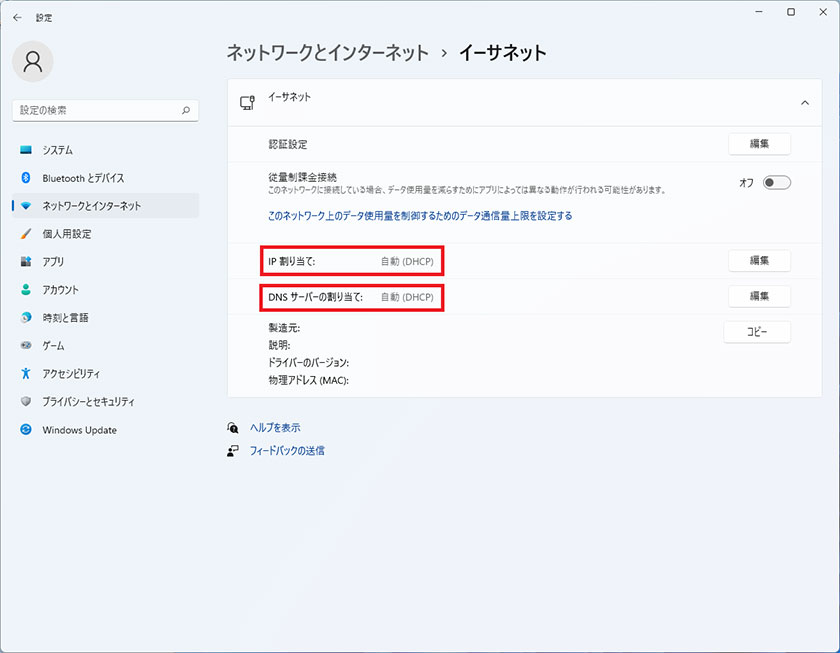 IP割り当て、DNSサーバーの割り当てが[自動(DHCP)]になっているかを確認します。