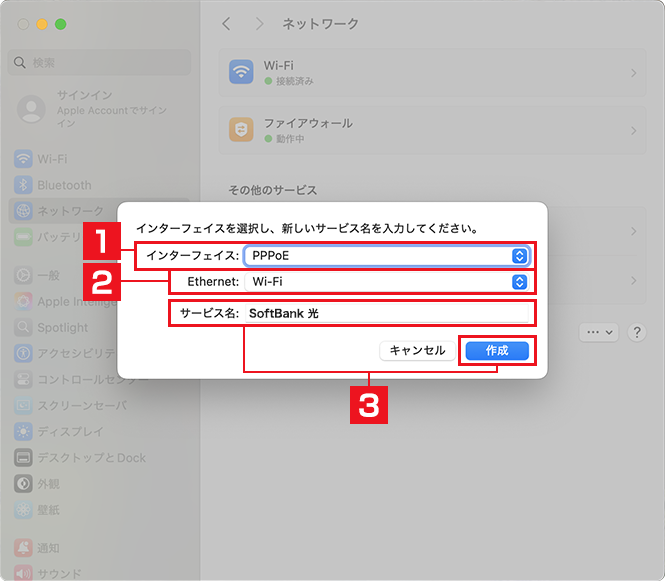 PPPoEサービスの名前に[SoftBank 光]など任意の[サービス名]をフィールドに入力し、[作成]をクリックします。