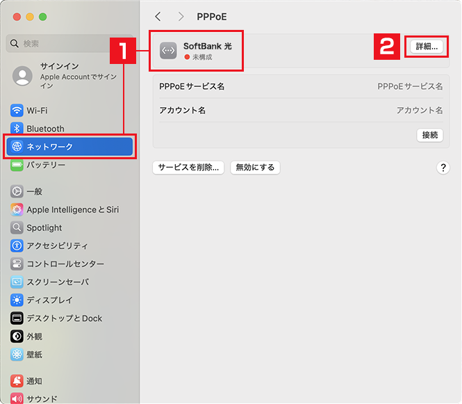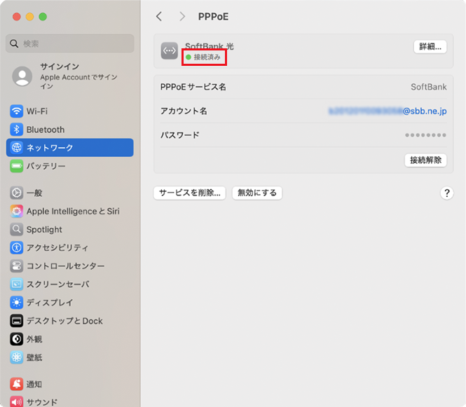 ネットワークサービスのリストで、作成した新しいPPPoEサービスを選択してください。