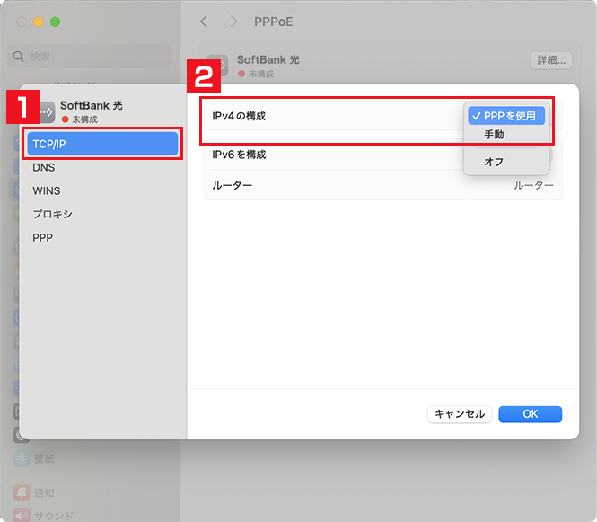 [インターフェイス]ポップアップメニューをクリックし、[PPPoE]を選択してください。