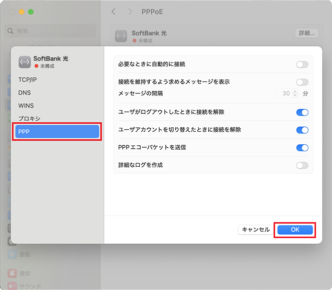 サイドバーで[PPP]をクリックし、必要に応じて使用可能なオプションのオン/オフを切り替え、[OK]をクリックしてください。