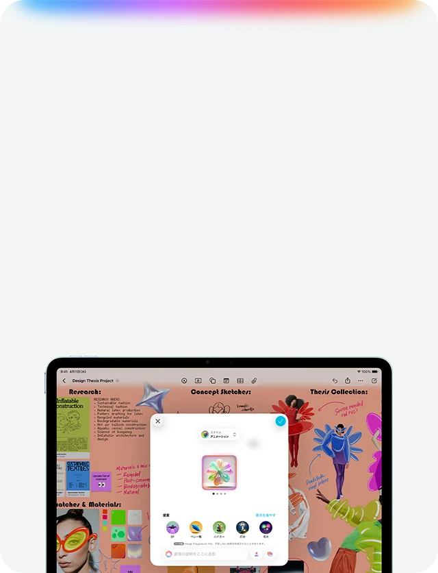 - Apple Intelligence:Apple Intelligenceはベータ版で利用できます。地域や言語によっては一部の機能を利用できない場合があります。利用できる機能と対応言語、システム条件についてはsupport.apple.com/ja-jp/121115をご覧ください。