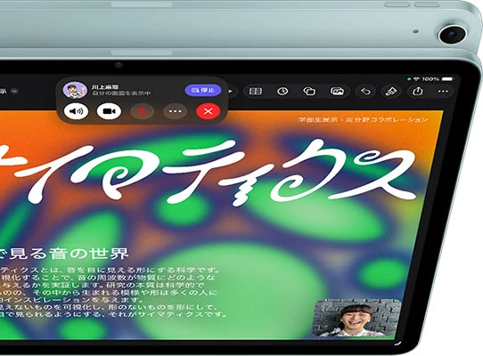 - 5G:データプランが必要です。5Gは特定の国の特定の通信事業者で利用できます。速度は使用する場所の条件と通信事業者によって変わります。5G対応の詳細については通信事業者にお問い合わせください。apple.com/jp/ipad/cellularもあわせてご覧ください。