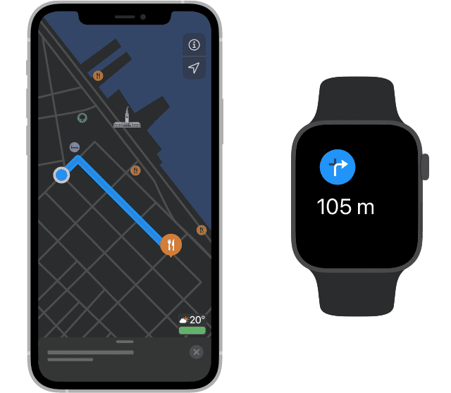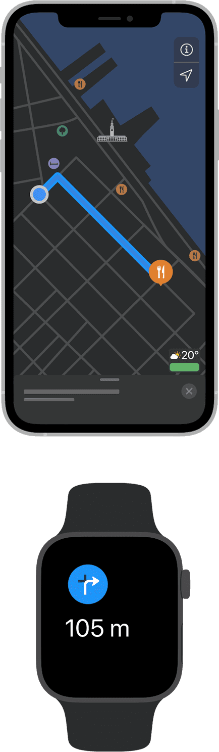 iPhone で道順を調べて、Apple Watch にタップで案内してもらう。