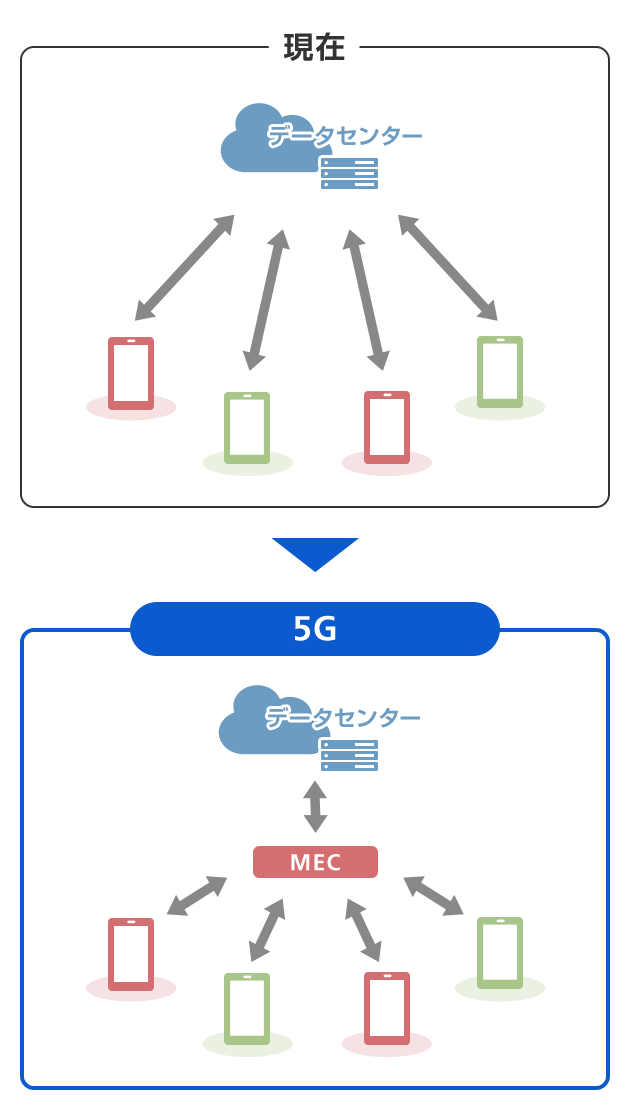 MEC(メック)とは、ユーザーの使うデバイスにより近い場所にサーバーの代わりをするコンピューターを置くことによって、通信の効率化を図る技術です。ユーザーに近い場所でデータ処理が行われるため、低遅延を実現することができます。