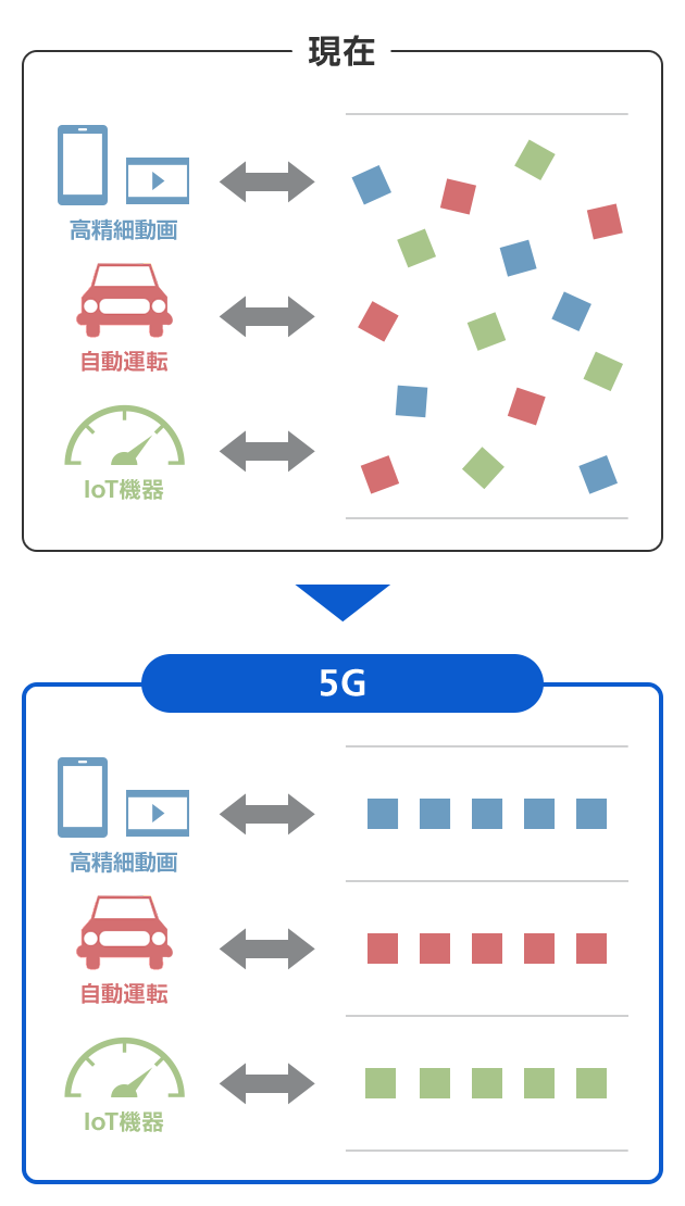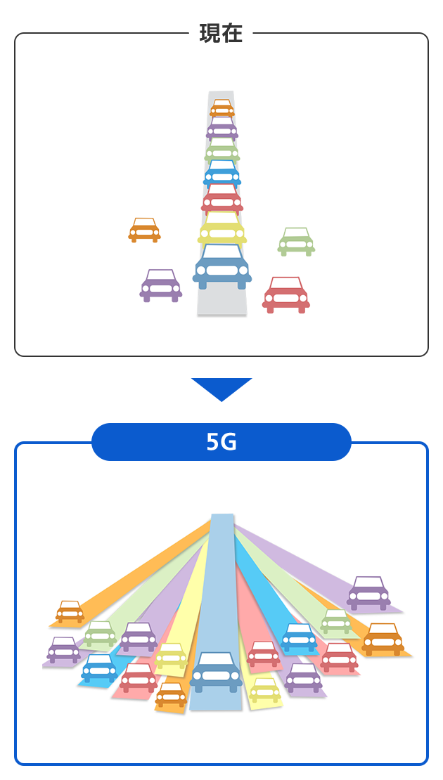 5Gは第5世代移動通信システムのことであり、従来の4Gと比べ通信スピードが速く(「高速大容量」)、ほとんど遅延なく(「低遅延」)、より多くの機器と通信ができる(「多接続」)という特徴を持っています。