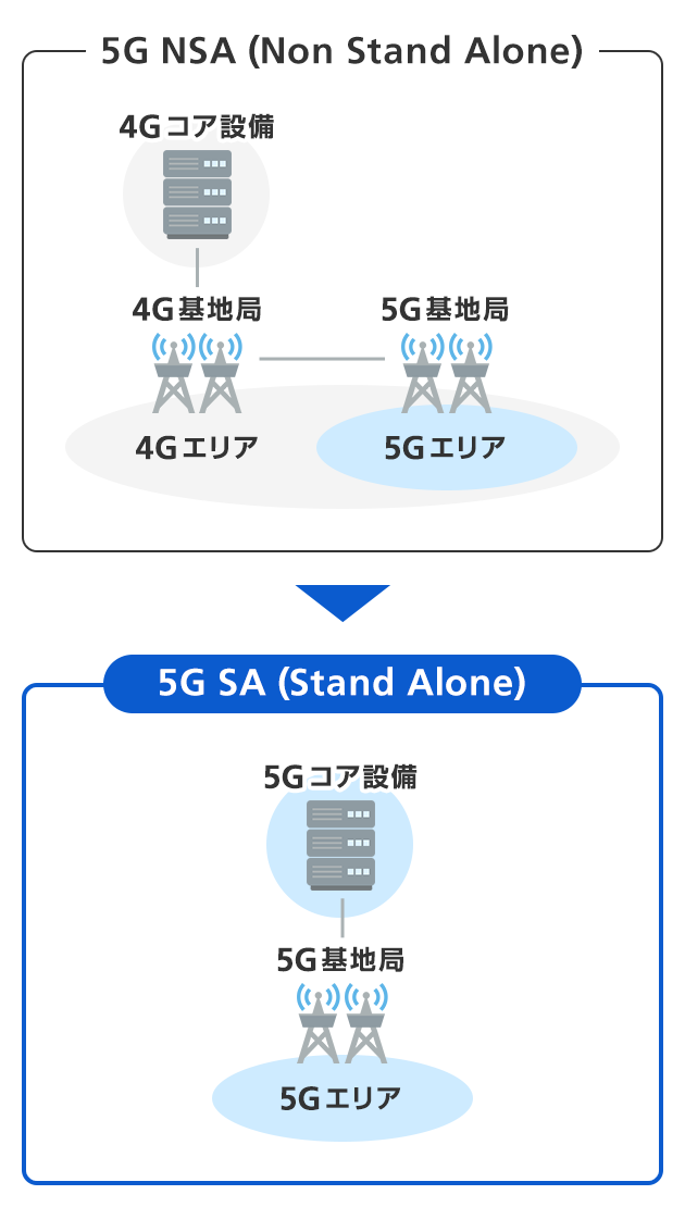 5G SA(5G スタンドアローン)とは、基地局だけでなく無線を制御するコア設備も含め、5G専用の技術と設備で構成されたネットワークシステムです。5G SAの特徴は、高速大容量の通信に加え、ネットワークスライシングなどの高度な技術をベースにした通信機能を提供できることにあります。