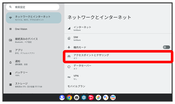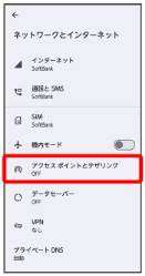ホーム画面で「設定」→「ネットワークとインターネット」→「アクセスポイントとテザリング」をクリックします。