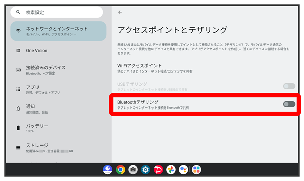 - Bluetooth® 接続でのテザリングを終了する場合は、タブレットの「Bluetoothテザリング」を無効にしてください。