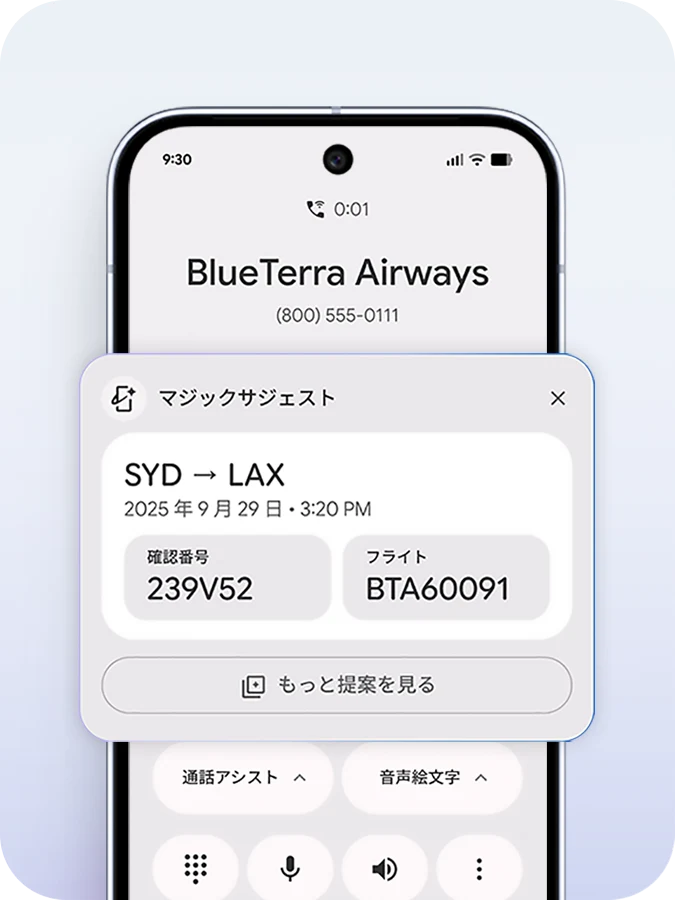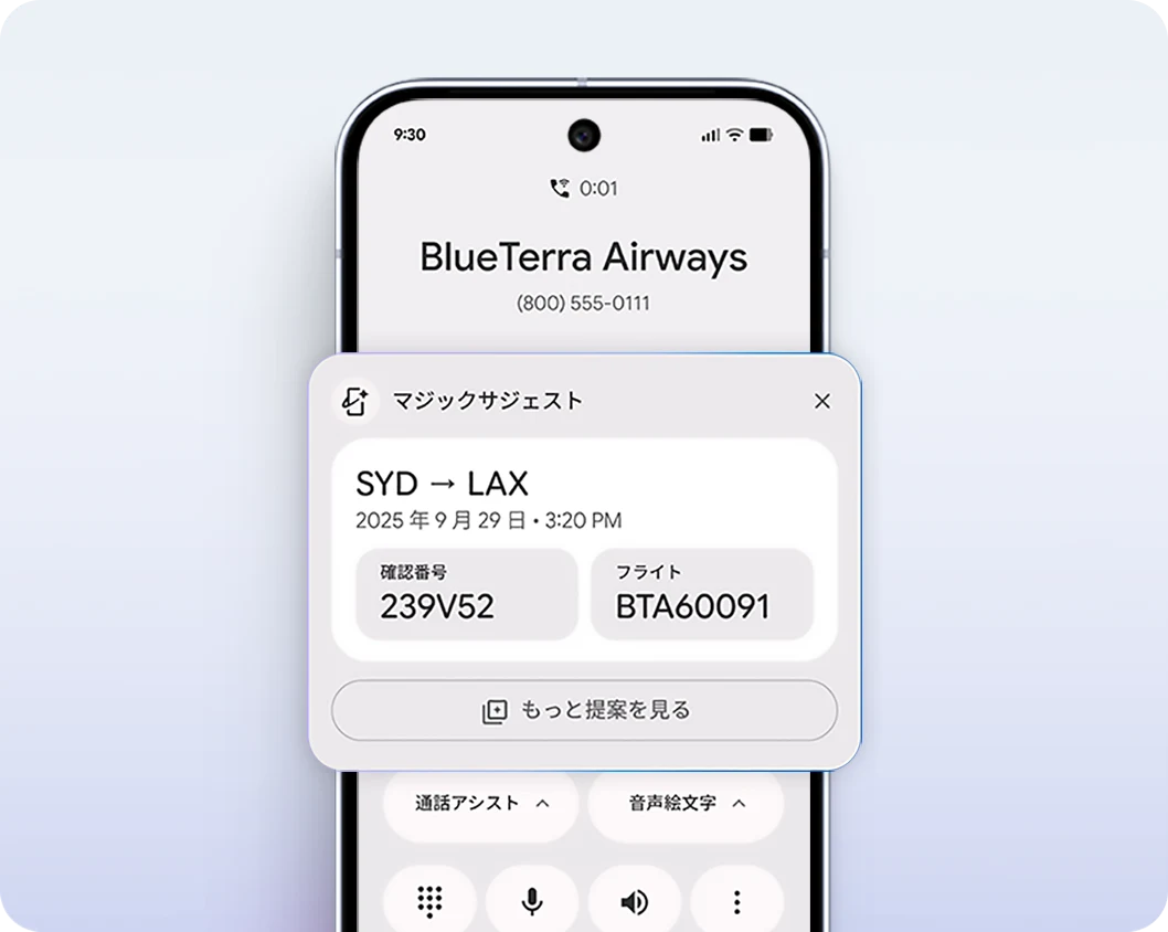 マジックサジェストは、関連性の高い情報や役立つ機能が AI の予想に基づいて提案され、ユーザーのデジタルライフがより便利になる機能です6。たとえば、あなたが航空会社に電話しようとすると、メールからフライト情報が検索されて表示されます6。