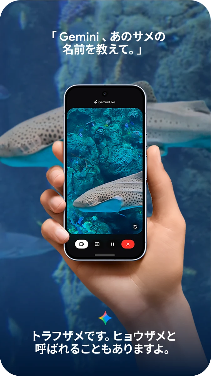 Gemini Live で、水族館の海の生物など興味を引かれたものにカメラを向けると、