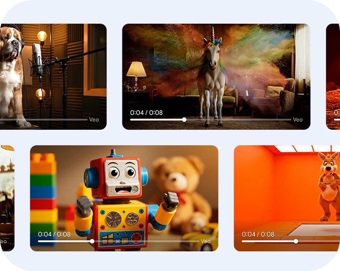 アイデアを説明するだけで、自然な音が高品質で入った短い動画を作成できます。画像をアップロードして、撮影するシーンを説明したり、動きや音によって写真が変化するのを確認したりすることができます4。