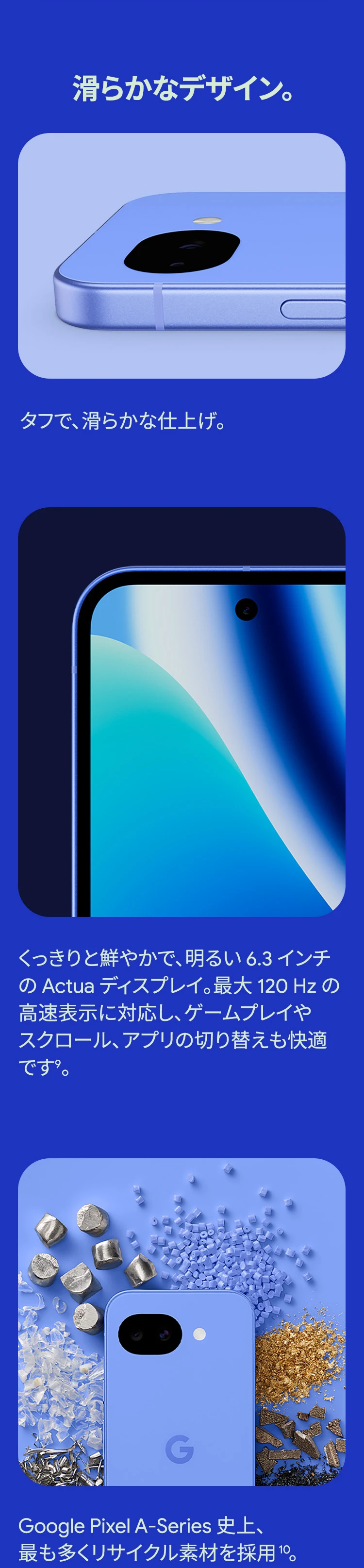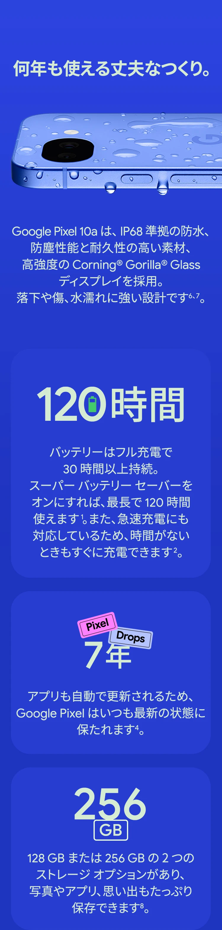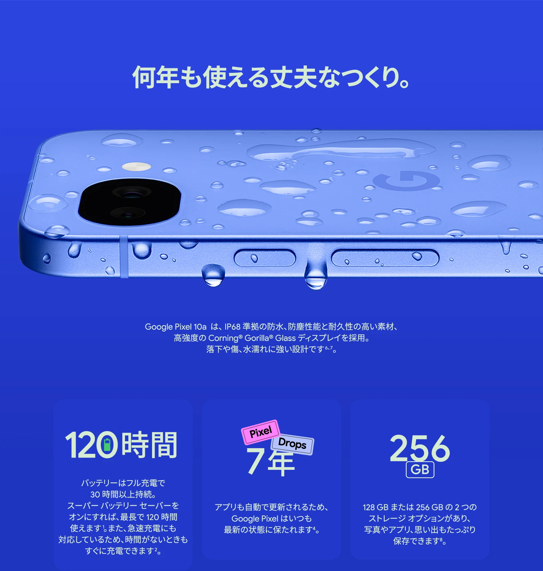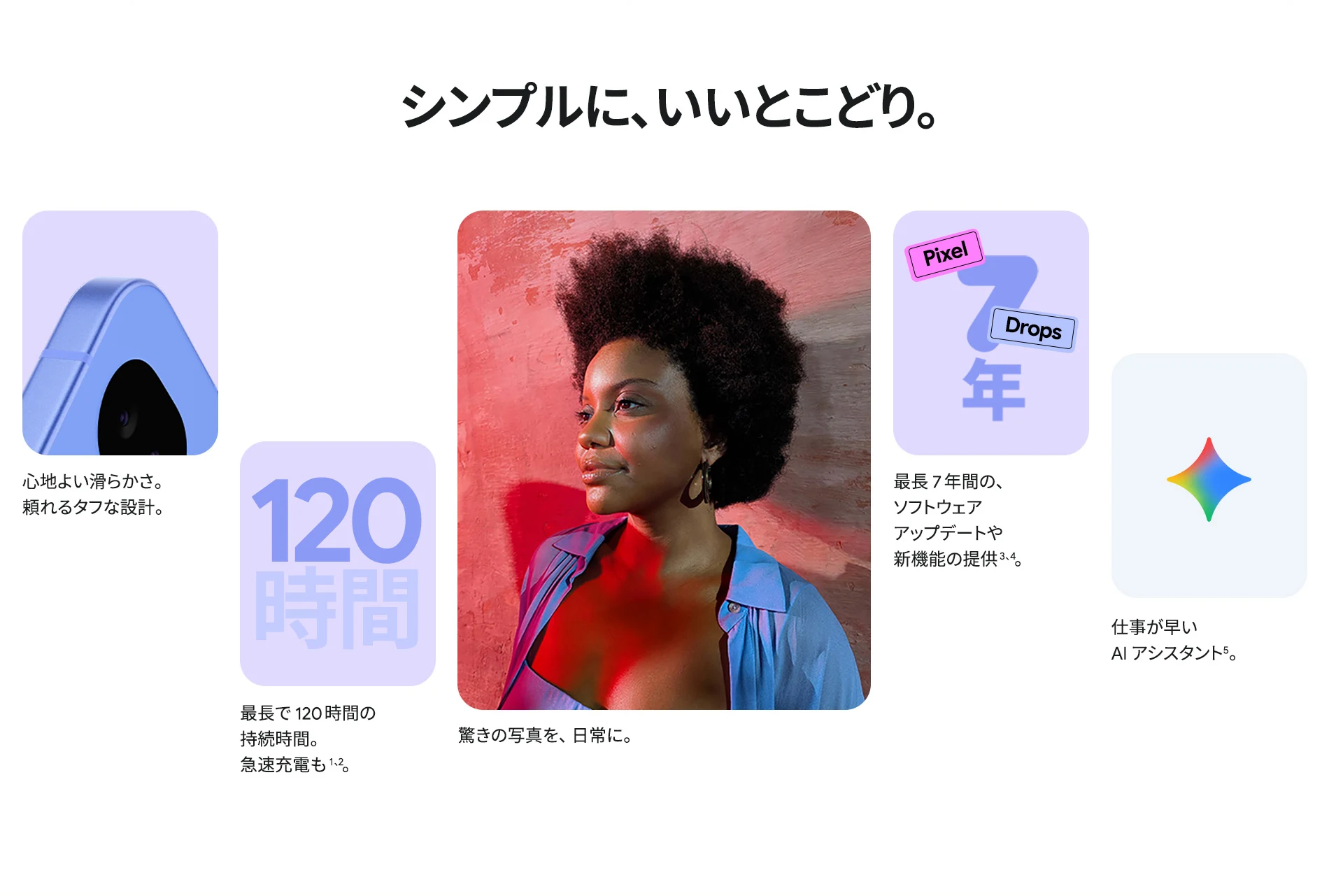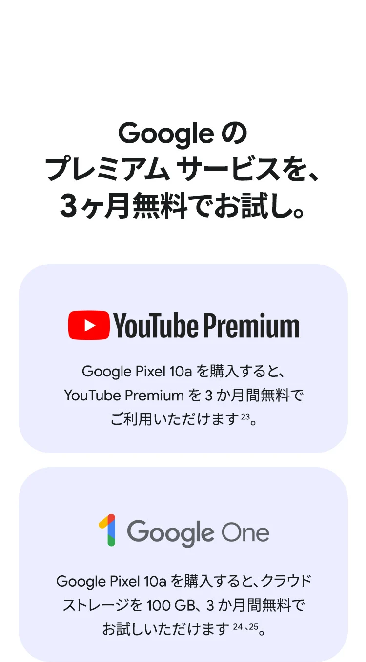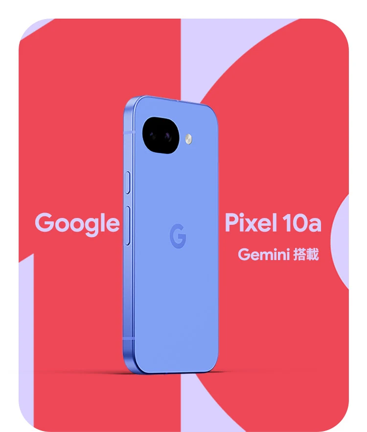 1 バッテリー駆動時間は、さまざまな要因によって変動し、特定の機能を使用すると短くなります。実際のバッテリー駆動時間はこれより短くなる可能性があります。長期にわたって使用してもバッテリーの健全性が保たれるよう、バッテリーのパフォーマンスは Google Pixel のソフトウェアにより継続的に管理されます。詳しくは g.co/pixel/battery-tests および g.co/pixel/batteryhealth をご覧ください。 2 Google 45W USB-C® 充電器(別売り)を使用すると、有線にて最大 30 W で充電が可能です。 3 Google Pixel アップデートが提供される期間は、米国の Google ストアでのデバイス販売開始日から 7 年間です。詳しくは、g.co/pixel/updates をご覧ください。 4 お使いの Google Pixel の Android OS アップデートおよびサポート期間中は、原則として Pixel Drop が提供されます。詳しくは、 g.co/pixel/updates をご覧ください。一部の Pixel Drop については、スマートフォンやデバイスの機種によって提供状況が異なる場合があります。 5 インターネット接続が必要です。機能は有料会員登録の有無やアカウントに応じて異なる場合があります。一部のアプリについてはセットアップが必要です。一部のデバイス、国、言語でご利用いただけます。 6 Google Pixel 9a との比較です。 7 デバイスは工場出荷時点で IEC 規格 60529 の IP68 の防水および防塵性能を満たすように設計されていますが、完全な防水または防塵ではありません。防水・防塵性能は永久的には持続せず、時間の経過に伴い、通常の使用による摩耗、デバイスの修理、分解、損傷によって徐々に低下または消失します。デバイスの耐落下性能は完全なものではありません。デバイスを落下させると、防水、防塵性能が失われる場合があります。落下その他の外的な衝撃による損傷は保証の対象外となります。液体による損傷の場合、保証が無効になります。詳しくは、 g.co/pixel/water をご覧ください。® GORILLA は、 Corning Incorporated の登録商標です。 8 ストレージの仕様はフォーマット前の容量を表しています。フォーマット後の実際の容量はこれより少なくなります。 9 ディスプレイは角に丸みがあります。長方形として対角線を測定したときのサイズは 6.3 インチです。実際の表示可能領域はこれより小さくなります。サイズは構成および製造工程によって異なる場合があります。 10 重量ベースで、製品の 36% 以上にリサイクル素材を使用しています。 11 使用状況によって結果は変化する場合があります。 12 詳しくは、g.co/photos/ask をご覧ください。使用状況によって結果は変化する場合があります。対象年齢は 18 歳以上です。 13 Gemini モバイルアプリの提供状況は、国と言語によって異なる場合があります。回答の正確性をお確かめください。インターネット接続が必要です。 14 説明を目的とした出力結果の例です。内容は状況に応じて変わります。回答の正確性をお確かめください。一部の機能とアカウントに対応しています。インターネット接続が必要です。一部の国と言語で利用できます。対象年齢は 18 歳以上です。 15 インターネット接続が必要です。利用できる機能は、サブスクリプションやアカウントによって異なる場合があります。一部のアプリについてはセットアップが必要です。一部のデバイス、国、言語でご利用いただけます。 16 インターネット接続、対応デバイス、対応アプリ、および対応サーフェスが必要です。結果は画像の一致状況によって異なります。 17 言語や国によって利用できない場合があります。詳しくは、 g.co/pixel/callassist をご覧ください。実際の結果は使用状況によって異なります。詳しくは、 g.co/pixel/callassist をご覧ください。 18 回答の正確性をお確かめください。一部の機能とアカウントに対応しています。インターネット接続が必要です。一部の国と言語で利用できます。対象年齢は 18 歳以上です。 AI 生成機能は、ご自身の責任でご利用ください。詳しくは、 policies.google.com/terms/generative-ai/use-policy をご覧ください。 19 制限事項が適用されます。 一部のデータは VPN を介さず送信されます。 一部の国ではご利用いただけません。 VPN を使用すると、料金プランによってはデータ費用が増加する可能性があります。詳しくは g.co/pixel/vpn をご覧ください。 20 言語や国・地域によっては、自動車事故検出を利用できない場合があります。自動車事故検出によってすべての事故が検出されるとは限りません。強い衝撃がかかることで、自動車事故検出が作動することがあります。この機能はネットワーク接続やその他の要因によって、緊急時の通信手段として利用できないことがあります。また、一部の地域ではご利用いただけない場合があります。詳しくは、 g.co/pixel/carcrashdetection をご確認ください。 21 Google Pixel 10 シリーズ、9 シリーズ ( Google Pixel 9a を除く) のデバイスでご利用いただけます。( 2026 年 3 月 17 日現在)。今後も対応機種は変更する可能性があります。本機能の動作に関す
