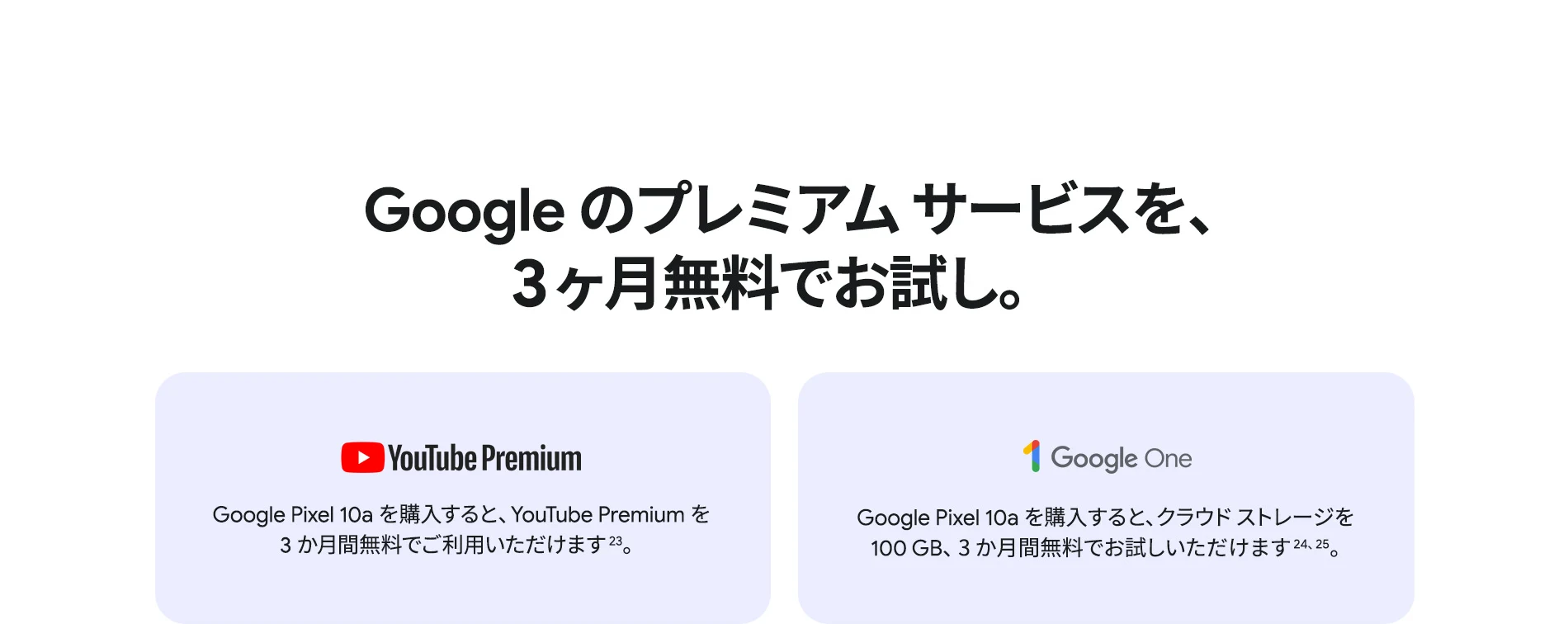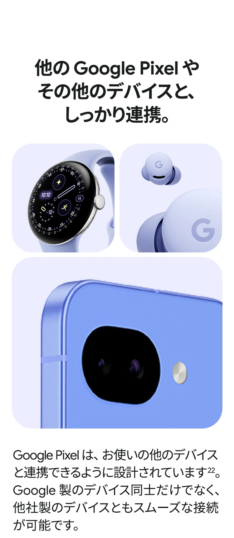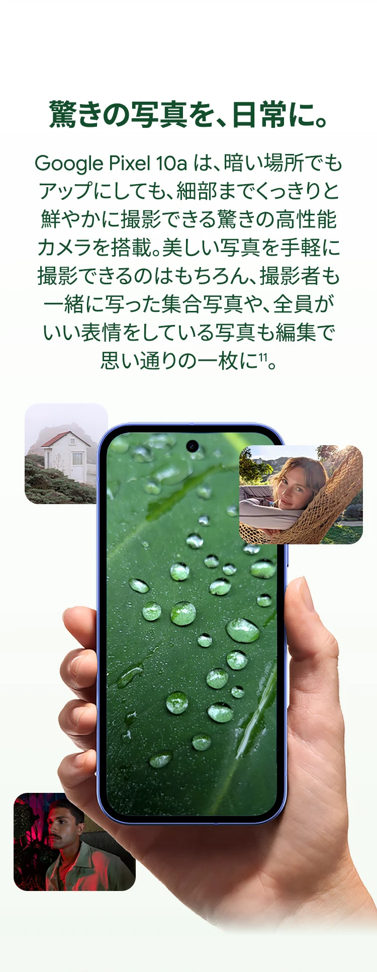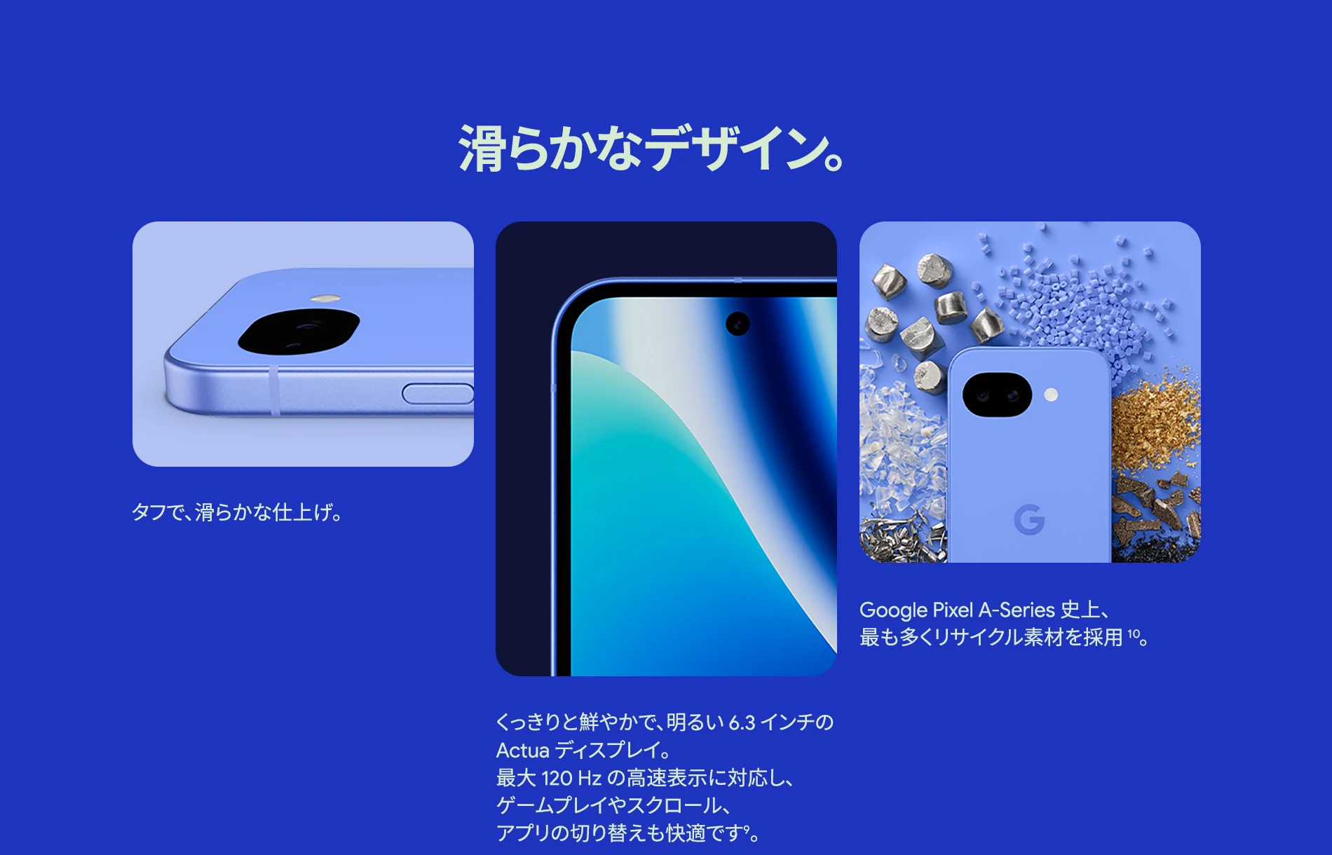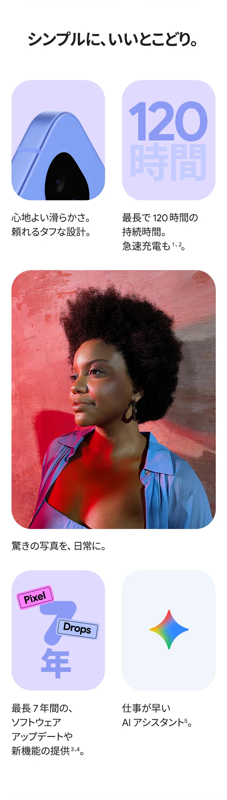 1 バッテリー駆動時間は、さまざまな要因によって変動し、特定の機能を使用すると短くなります。実際のバッテリー駆動時間はこれより短くなる可能性があります。長期にわたって使用してもバッテリーの健全性が保たれるよう、バッテリーのパフォーマンスは Google Pixel のソフトウェアにより継続的に管理されます。詳しくは g.co/pixel/battery-tests および g.co/pixel/batteryhealth をご覧ください。 2 Google 45W USB-C® 充電器(別売り)を使用すると、有線にて最大 30 W で充電が可能です。 3 Google Pixel アップデートが提供される期間は、米国の Google ストアでのデバイス販売開始日から 7 年間です。詳しくは、g.co/pixel/updates をご覧ください。 4 お使いの Google Pixel の Android OS アップデートおよびサポート期間中は、原則として Pixel Drop が提供されます。詳しくは、 g.co/pixel/updates をご覧ください。一部の Pixel Drop については、スマートフォンやデバイスの機種によって提供状況が異なる場合があります。 5 インターネット接続が必要です。機能は有料会員登録の有無やアカウントに応じて異なる場合があります。一部のアプリについてはセットアップが必要です。一部のデバイス、国、言語でご利用いただけます。 6 Google Pixel 9a との比較です。 7 デバイスは工場出荷時点で IEC 規格 60529 の IP68 の防水および防塵性能を満たすように設計されていますが、完全な防水または防塵ではありません。防水・防塵性能は永久的には持続せず、時間の経過に伴い、通常の使用による摩耗、デバイスの修理、分解、損傷によって徐々に低下または消失します。デバイスの耐落下性能は完全なものではありません。デバイスを落下させると、防水、防塵性能が失われる場合があります。落下その他の外的な衝撃による損傷は保証の対象外となります。液体による損傷の場合、保証が無効になります。詳しくは、 g.co/pixel/water をご覧ください。® GORILLA は、 Corning Incorporated の登録商標です。 8 ストレージの仕様はフォーマット前の容量を表しています。フォーマット後の実際の容量はこれより少なくなります。 9 ディスプレイは角に丸みがあります。長方形として対角線を測定したときのサイズは 6.3 インチです。実際の表示可能領域はこれより小さくなります。サイズは構成および製造工程によって異なる場合があります。 10 重量ベースで、製品の 36% 以上にリサイクル素材を使用しています。 11 使用状況によって結果は変化する場合があります。 12 詳しくは、g.co/photos/ask をご覧ください。使用状況によって結果は変化する場合があります。対象年齢は 18 歳以上です。 13 Gemini モバイルアプリの提供状況は、国と言語によって異なる場合があります。回答の正確性をお確かめください。インターネット接続が必要です。 14 説明を目的とした出力結果の例です。内容は状況に応じて変わります。回答の正確性をお確かめください。一部の機能とアカウントに対応しています。インターネット接続が必要です。一部の国と言語で利用できます。対象年齢は 18 歳以上です。 15 インターネット接続が必要です。利用できる機能は、サブスクリプションやアカウントによって異なる場合があります。一部のアプリについてはセットアップが必要です。一部のデバイス、国、言語でご利用いただけます。 16 インターネット接続、対応デバイス、対応アプリ、および対応サーフェスが必要です。結果は画像の一致状況によって異なります。 17 言語や国によって利用できない場合があります。詳しくは、 g.co/pixel/callassist をご覧ください。実際の結果は使用状況によって異なります。詳しくは、 g.co/pixel/callassist をご覧ください。 18 回答の正確性をお確かめください。一部の機能とアカウントに対応しています。インターネット接続が必要です。一部の国と言語で利用できます。対象年齢は 18 歳以上です。 AI 生成機能は、ご自身の責任でご利用ください。詳しくは、 policies.google.com/terms/generative-ai/use-policy をご覧ください。 19 制限事項が適用されます。 一部のデータは VPN を介さず送信されます。 一部の国ではご利用いただけません。 VPN を使用すると、料金プランによってはデータ費用が増加する可能性があります。詳しくは g.co/pixel/vpn をご覧ください。 20 言語や国・地域によっては、自動車事故検出を利用できない場合があります。自動車事故検出によってすべての事故が検出されるとは限りません。強い衝撃がかかることで、自動車事故検出が作動することがあります。この機能はネットワーク接続やその他の要因によって、緊急時の通信手段として利用できないことがあります。また、一部の地域ではご利用いただけない場合があります。詳しくは、 g.co/pixel/carcrashdetection をご確認ください。 21 Google Pixel 10 シリーズ、9 シリーズ ( Google Pixel 9a を除く) のデバイスでご利用いただけます。( 2026 年 3 月 17 日現在)。今後も対応機種は変更する可能性があります。本機能の動作に関す