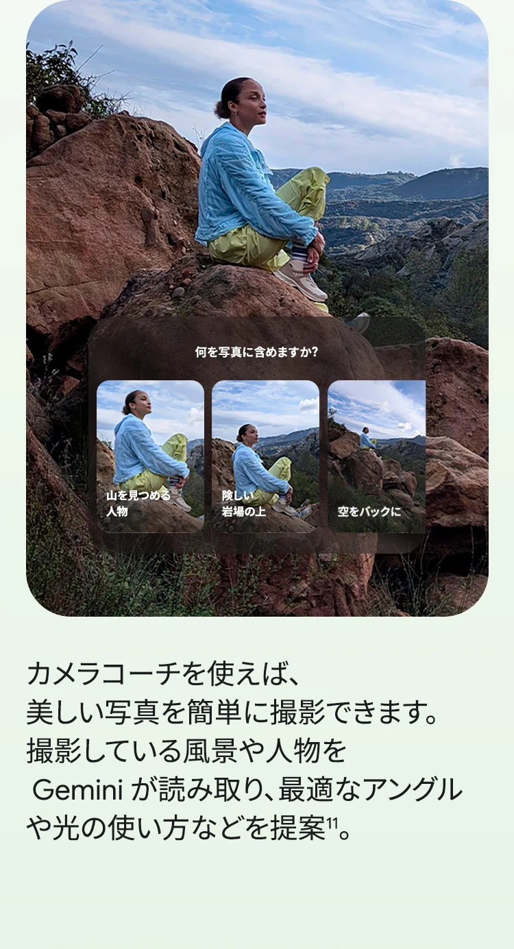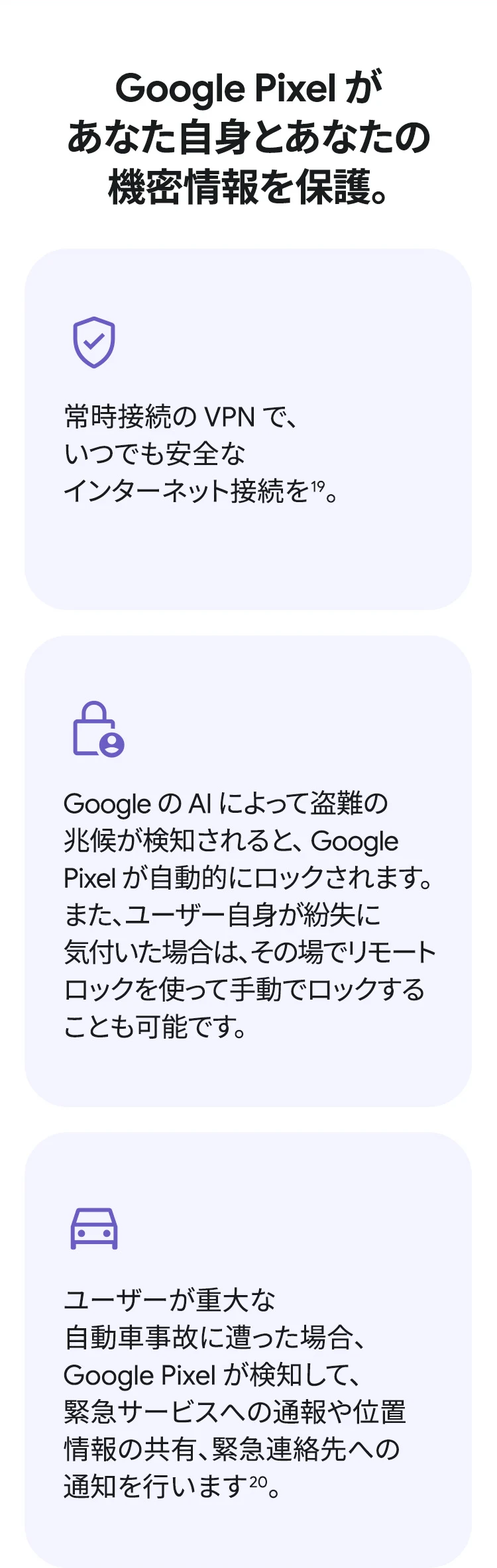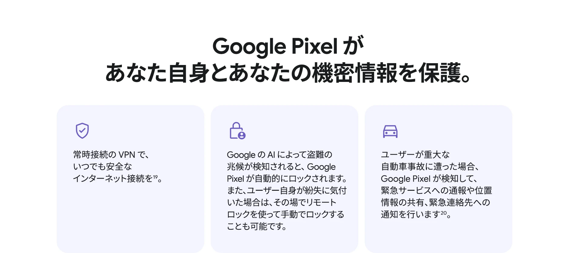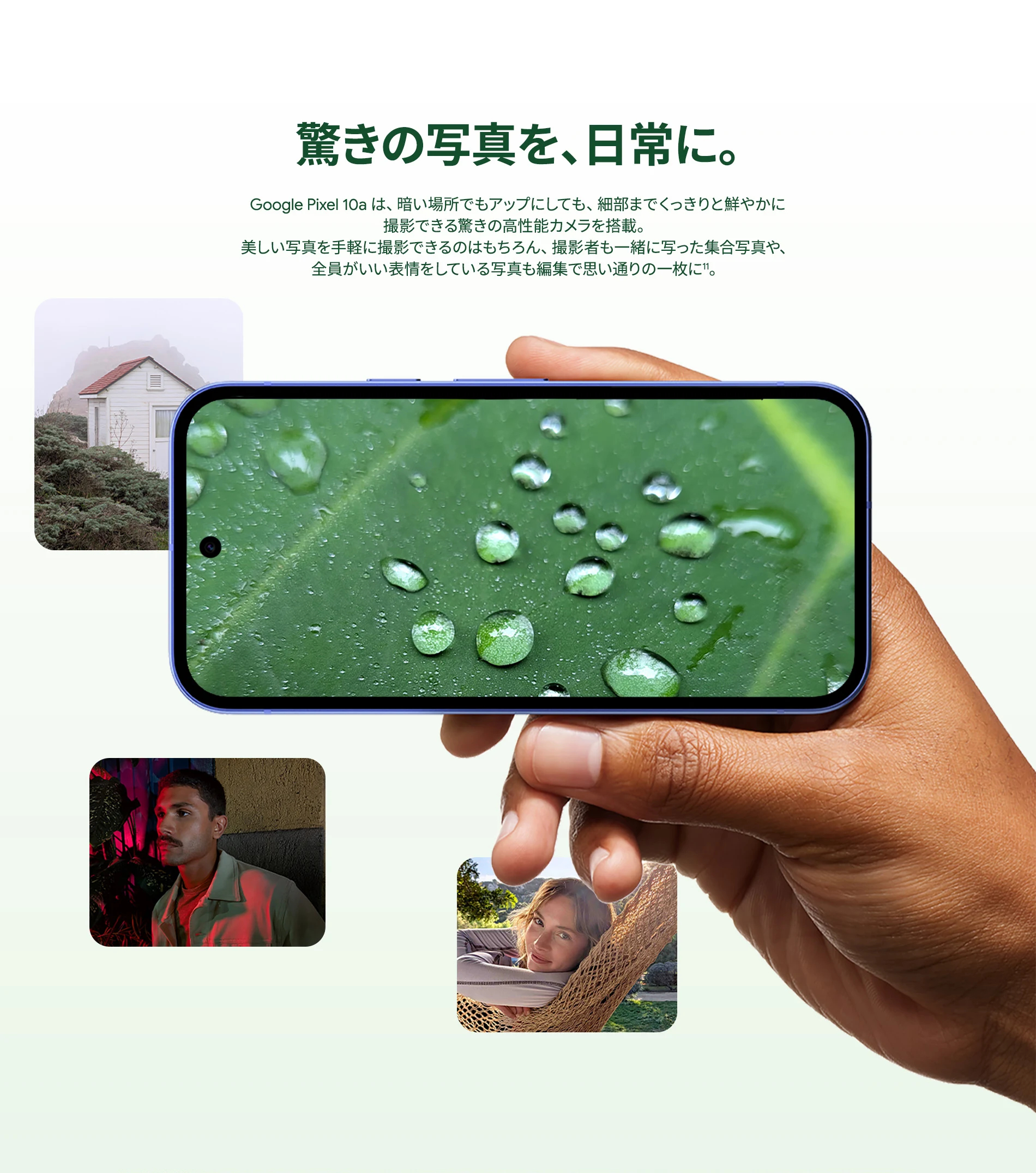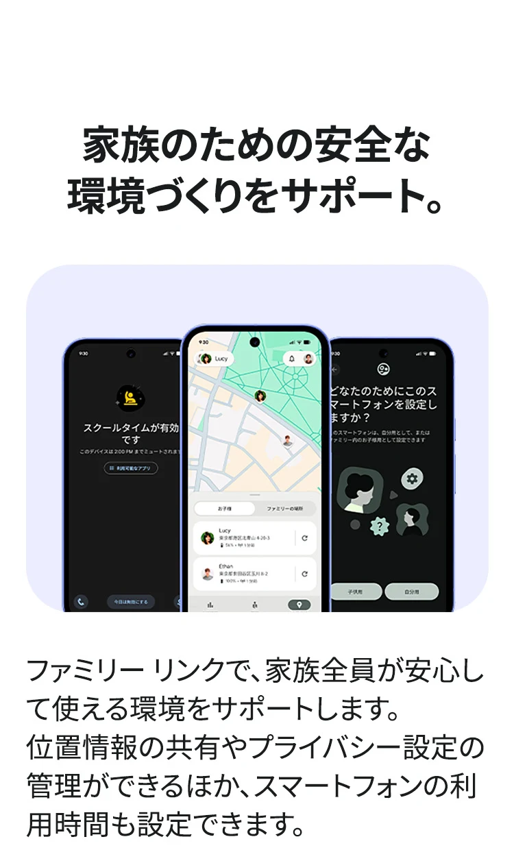 1 バッテリー駆動時間は、さまざまな要因によって変動し、特定の機能を使用すると短くなります。実際のバッテリー駆動時間はこれより短くなる可能性があります。長期にわたって使用してもバッテリーの健全性が保たれるよう、バッテリーのパフォーマンスは Google Pixel のソフトウェアにより継続的に管理されます。詳しくは g.co/pixel/battery-tests および g.co/pixel/batteryhealth をご覧ください。 2 Google 45W USB-C® 充電器(別売り)を使用すると、有線にて最大 30 W で充電が可能です。 3 Google Pixel アップデートが提供される期間は、米国の Google ストアでのデバイス販売開始日から 7 年間です。詳しくは、g.co/pixel/updates をご覧ください。 4 お使いの Google Pixel の Android OS アップデートおよびサポート期間中は、原則として Pixel Drop が提供されます。詳しくは、 g.co/pixel/updates をご覧ください。一部の Pixel Drop については、スマートフォンやデバイスの機種によって提供状況が異なる場合があります。 5 インターネット接続が必要です。機能は有料会員登録の有無やアカウントに応じて異なる場合があります。一部のアプリについてはセットアップが必要です。一部のデバイス、国、言語でご利用いただけます。 6 Google Pixel 9a との比較です。 7 デバイスは工場出荷時点で IEC 規格 60529 の IP68 の防水および防塵性能を満たすように設計されていますが、完全な防水または防塵ではありません。防水・防塵性能は永久的には持続せず、時間の経過に伴い、通常の使用による摩耗、デバイスの修理、分解、損傷によって徐々に低下または消失します。デバイスの耐落下性能は完全なものではありません。デバイスを落下させると、防水、防塵性能が失われる場合があります。落下その他の外的な衝撃による損傷は保証の対象外となります。液体による損傷の場合、保証が無効になります。詳しくは、 g.co/pixel/water をご覧ください。® GORILLA は、 Corning Incorporated の登録商標です。 8 ストレージの仕様はフォーマット前の容量を表しています。フォーマット後の実際の容量はこれより少なくなります。 9 ディスプレイは角に丸みがあります。長方形として対角線を測定したときのサイズは 6.3 インチです。実際の表示可能領域はこれより小さくなります。サイズは構成および製造工程によって異なる場合があります。 10 重量ベースで、製品の 36% 以上にリサイクル素材を使用しています。 11 使用状況によって結果は変化する場合があります。 12 詳しくは、g.co/photos/ask をご覧ください。使用状況によって結果は変化する場合があります。対象年齢は 18 歳以上です。 13 Gemini モバイルアプリの提供状況は、国と言語によって異なる場合があります。回答の正確性をお確かめください。インターネット接続が必要です。 14 説明を目的とした出力結果の例です。内容は状況に応じて変わります。回答の正確性をお確かめください。一部の機能とアカウントに対応しています。インターネット接続が必要です。一部の国と言語で利用できます。対象年齢は 18 歳以上です。 15 インターネット接続が必要です。利用できる機能は、サブスクリプションやアカウントによって異なる場合があります。一部のアプリについてはセットアップが必要です。一部のデバイス、国、言語でご利用いただけます。 16 インターネット接続、対応デバイス、対応アプリ、および対応サーフェスが必要です。結果は画像の一致状況によって異なります。 17 言語や国によって利用できない場合があります。詳しくは、 g.co/pixel/callassist をご覧ください。実際の結果は使用状況によって異なります。詳しくは、 g.co/pixel/callassist をご覧ください。 18 回答の正確性をお確かめください。一部の機能とアカウントに対応しています。インターネット接続が必要です。一部の国と言語で利用できます。対象年齢は 18 歳以上です。 AI 生成機能は、ご自身の責任でご利用ください。詳しくは、 policies.google.com/terms/generative-ai/use-policy をご覧ください。 19 制限事項が適用されます。 一部のデータは VPN を介さず送信されます。 一部の国ではご利用いただけません。 VPN を使用すると、料金プランによってはデータ費用が増加する可能性があります。詳しくは g.co/pixel/vpn をご覧ください。 20 言語や国・地域によっては、自動車事故検出を利用できない場合があります。自動車事故検出によってすべての事故が検出されるとは限りません。強い衝撃がかかることで、自動車事故検出が作動することがあります。この機能はネットワーク接続やその他の要因によって、緊急時の通信手段として利用できないことがあります。また、一部の地域ではご利用いただけない場合があります。詳しくは、 g.co/pixel/carcrashdetection をご確認ください。 21 Google Pixel 10 シリーズ、9 シリーズ ( Google Pixel 9a を除く) のデバイスでご利用いただけます。( 2026 年 3 月 17 日現在)。今後も対応機種は変更する可能性があります。本機能の動作に関す