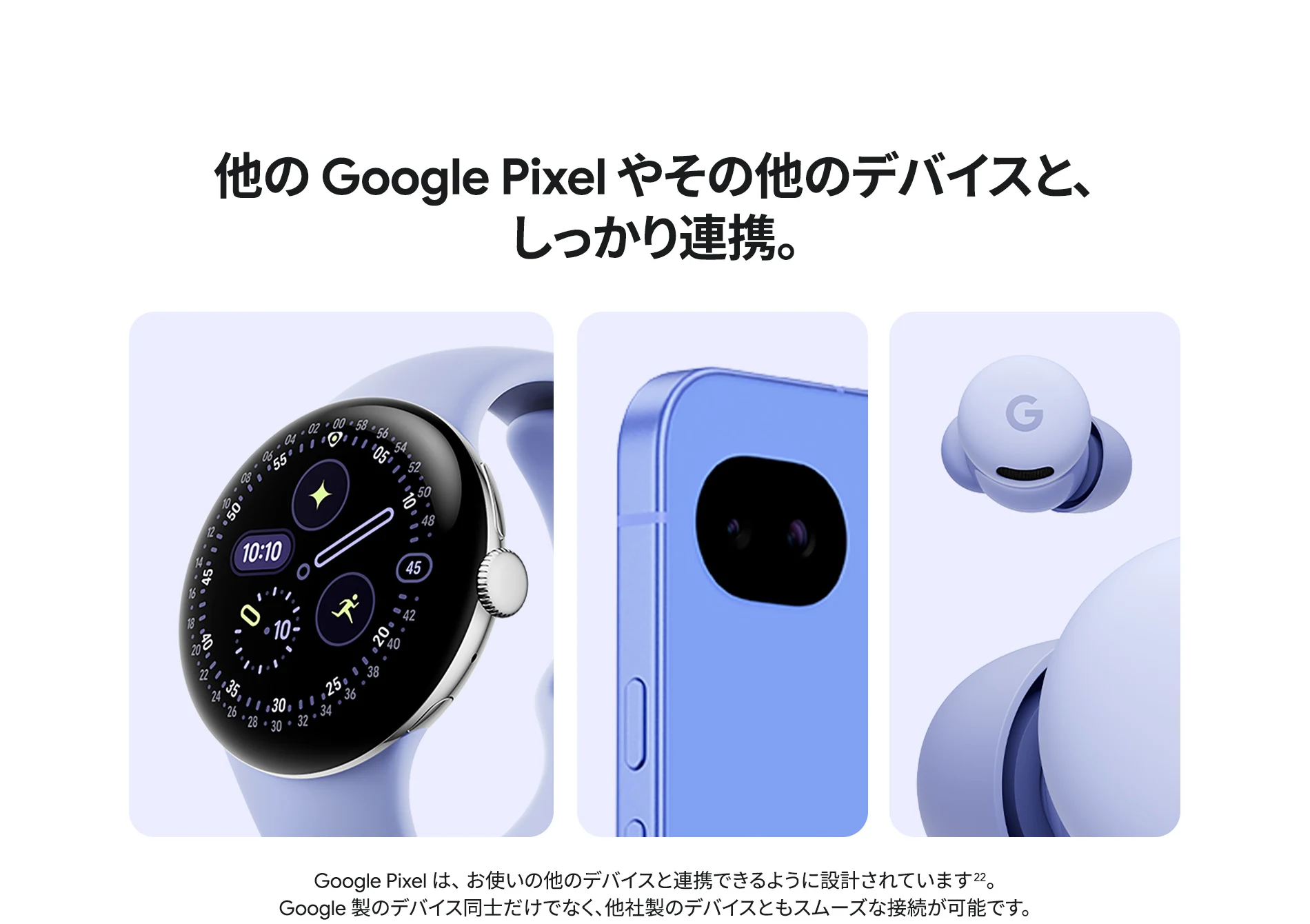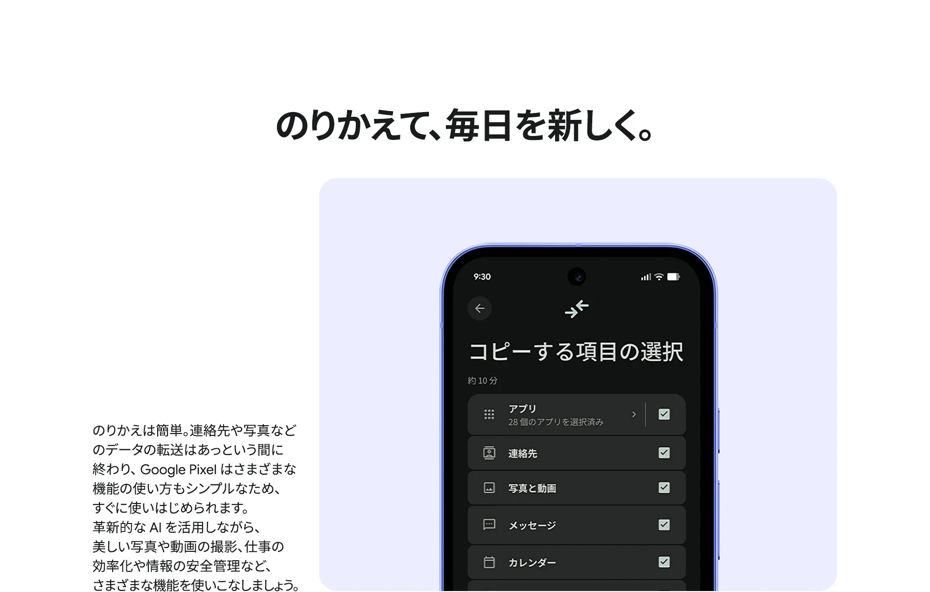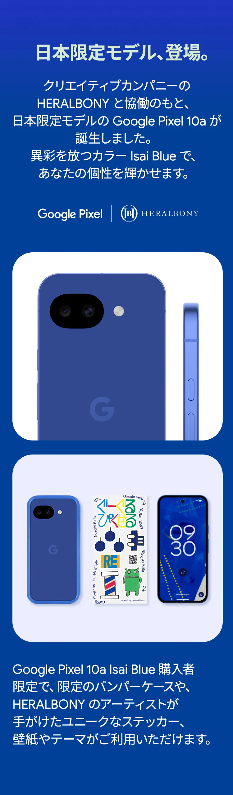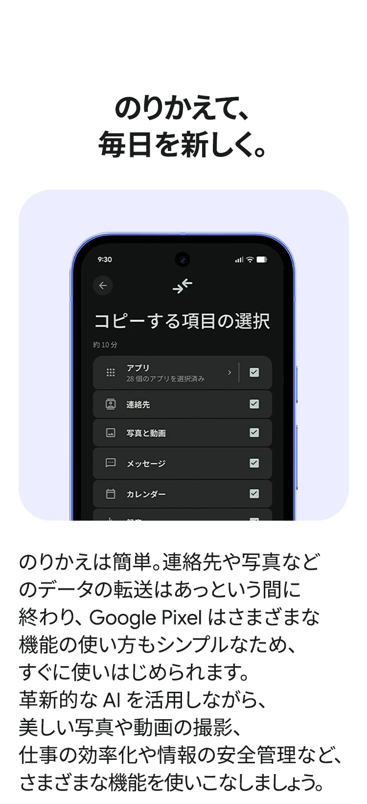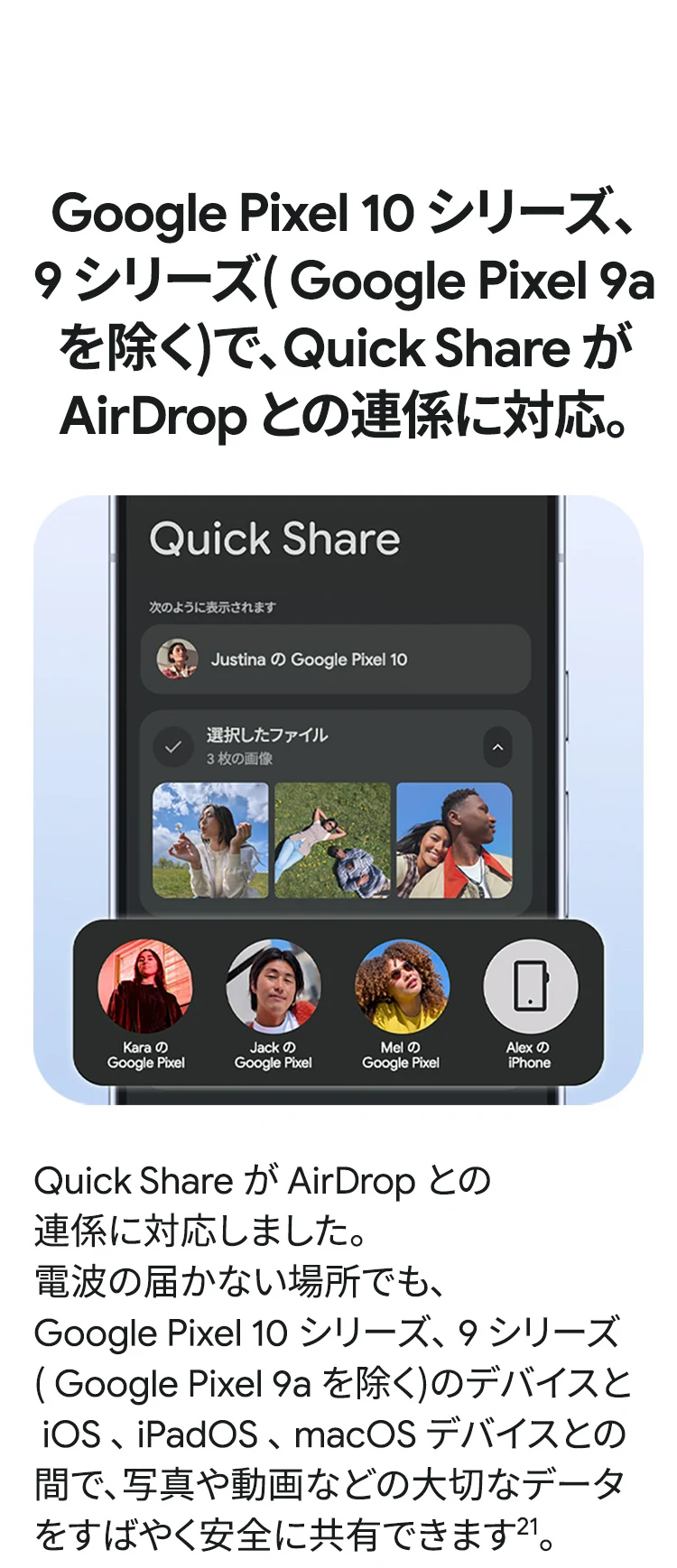 1 バッテリー駆動時間は、さまざまな要因によって変動し、特定の機能を使用すると短くなります。実際のバッテリー駆動時間はこれより短くなる可能性があります。長期にわたって使用してもバッテリーの健全性が保たれるよう、バッテリーのパフォーマンスは Google Pixel のソフトウェアにより継続的に管理されます。詳しくは g.co/pixel/battery-tests および g.co/pixel/batteryhealth をご覧ください。 2 Google 45W USB-C® 充電器(別売り)を使用すると、有線にて最大 30 W で充電が可能です。 3 Google Pixel アップデートが提供される期間は、米国の Google ストアでのデバイス販売開始日から 7 年間です。詳しくは、g.co/pixel/updates をご覧ください。 4 お使いの Google Pixel の Android OS アップデートおよびサポート期間中は、原則として Pixel Drop が提供されます。詳しくは、 g.co/pixel/updates をご覧ください。一部の Pixel Drop については、スマートフォンやデバイスの機種によって提供状況が異なる場合があります。 5 インターネット接続が必要です。機能は有料会員登録の有無やアカウントに応じて異なる場合があります。一部のアプリについてはセットアップが必要です。一部のデバイス、国、言語でご利用いただけます。 6 Google Pixel 9a との比較です。 7 デバイスは工場出荷時点で IEC 規格 60529 の IP68 の防水および防塵性能を満たすように設計されていますが、完全な防水または防塵ではありません。防水・防塵性能は永久的には持続せず、時間の経過に伴い、通常の使用による摩耗、デバイスの修理、分解、損傷によって徐々に低下または消失します。デバイスの耐落下性能は完全なものではありません。デバイスを落下させると、防水、防塵性能が失われる場合があります。落下その他の外的な衝撃による損傷は保証の対象外となります。液体による損傷の場合、保証が無効になります。詳しくは、 g.co/pixel/water をご覧ください。® GORILLA は、 Corning Incorporated の登録商標です。 8 ストレージの仕様はフォーマット前の容量を表しています。フォーマット後の実際の容量はこれより少なくなります。 9 ディスプレイは角に丸みがあります。長方形として対角線を測定したときのサイズは 6.3 インチです。実際の表示可能領域はこれより小さくなります。サイズは構成および製造工程によって異なる場合があります。 10 重量ベースで、製品の 36% 以上にリサイクル素材を使用しています。 11 使用状況によって結果は変化する場合があります。 12 詳しくは、g.co/photos/ask をご覧ください。使用状況によって結果は変化する場合があります。対象年齢は 18 歳以上です。 13 Gemini モバイルアプリの提供状況は、国と言語によって異なる場合があります。回答の正確性をお確かめください。インターネット接続が必要です。 14 説明を目的とした出力結果の例です。内容は状況に応じて変わります。回答の正確性をお確かめください。一部の機能とアカウントに対応しています。インターネット接続が必要です。一部の国と言語で利用できます。対象年齢は 18 歳以上です。 15 インターネット接続が必要です。利用できる機能は、サブスクリプションやアカウントによって異なる場合があります。一部のアプリについてはセットアップが必要です。一部のデバイス、国、言語でご利用いただけます。 16 インターネット接続、対応デバイス、対応アプリ、および対応サーフェスが必要です。結果は画像の一致状況によって異なります。 17 言語や国によって利用できない場合があります。詳しくは、 g.co/pixel/callassist をご覧ください。実際の結果は使用状況によって異なります。詳しくは、 g.co/pixel/callassist をご覧ください。 18 回答の正確性をお確かめください。一部の機能とアカウントに対応しています。インターネット接続が必要です。一部の国と言語で利用できます。対象年齢は 18 歳以上です。 AI 生成機能は、ご自身の責任でご利用ください。詳しくは、 policies.google.com/terms/generative-ai/use-policy をご覧ください。 19 制限事項が適用されます。 一部のデータは VPN を介さず送信されます。 一部の国ではご利用いただけません。 VPN を使用すると、料金プランによってはデータ費用が増加する可能性があります。詳しくは g.co/pixel/vpn をご覧ください。 20 言語や国・地域によっては、自動車事故検出を利用できない場合があります。自動車事故検出によってすべての事故が検出されるとは限りません。強い衝撃がかかることで、自動車事故検出が作動することがあります。この機能はネットワーク接続やその他の要因によって、緊急時の通信手段として利用できないことがあります。また、一部の地域ではご利用いただけない場合があります。詳しくは、 g.co/pixel/carcrashdetection をご確認ください。 21 Google Pixel 10 シリーズ、9 シリーズ ( Google Pixel 9a を除く) のデバイスでご利用いただけます。( 2026 年 3 月 17 日現在)。今後も対応機種は変更する可能性があります。本機能の動作に関す
