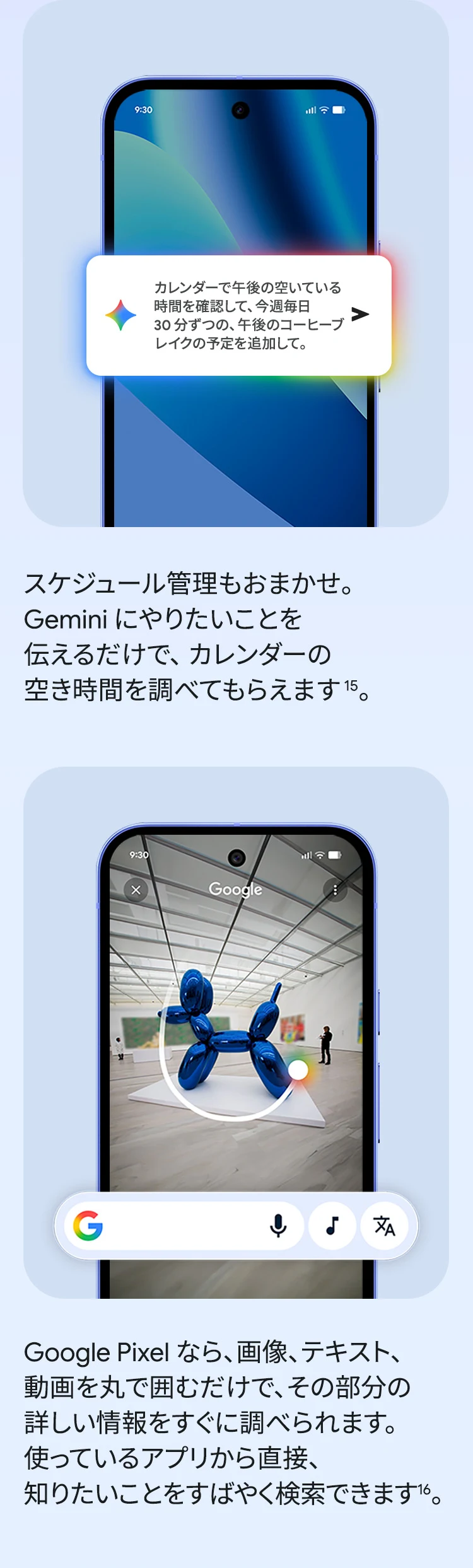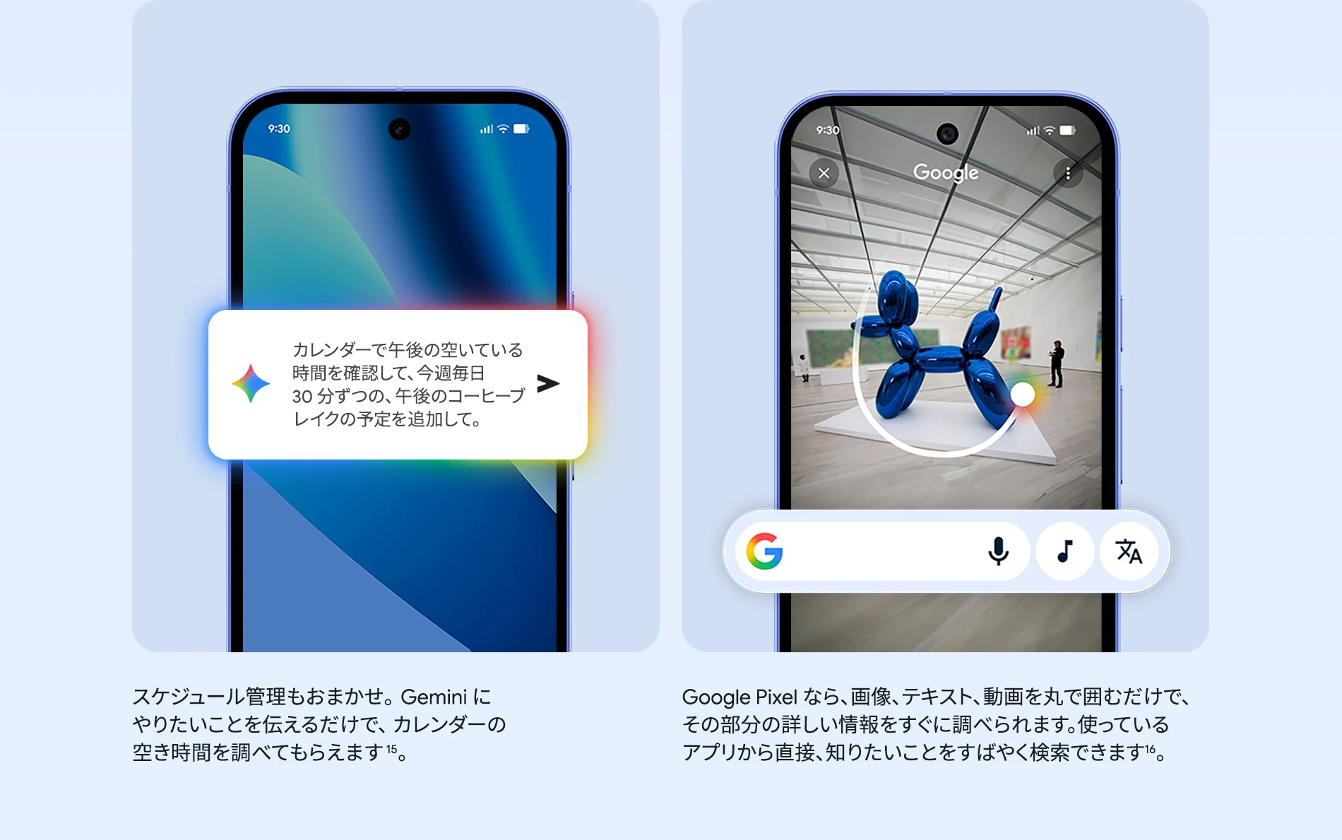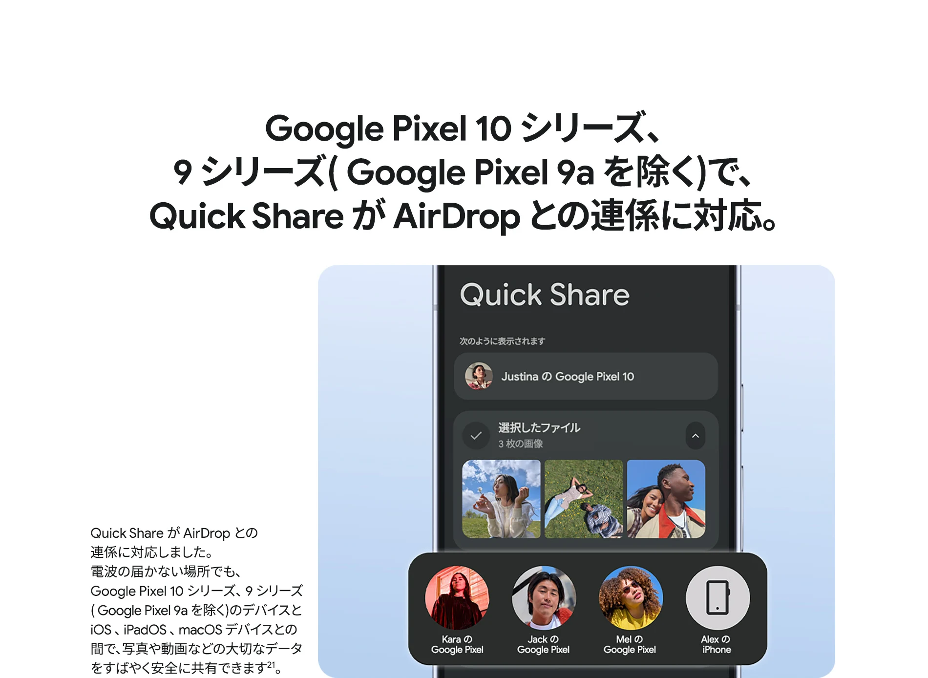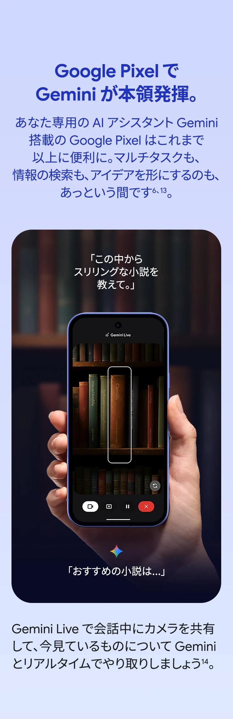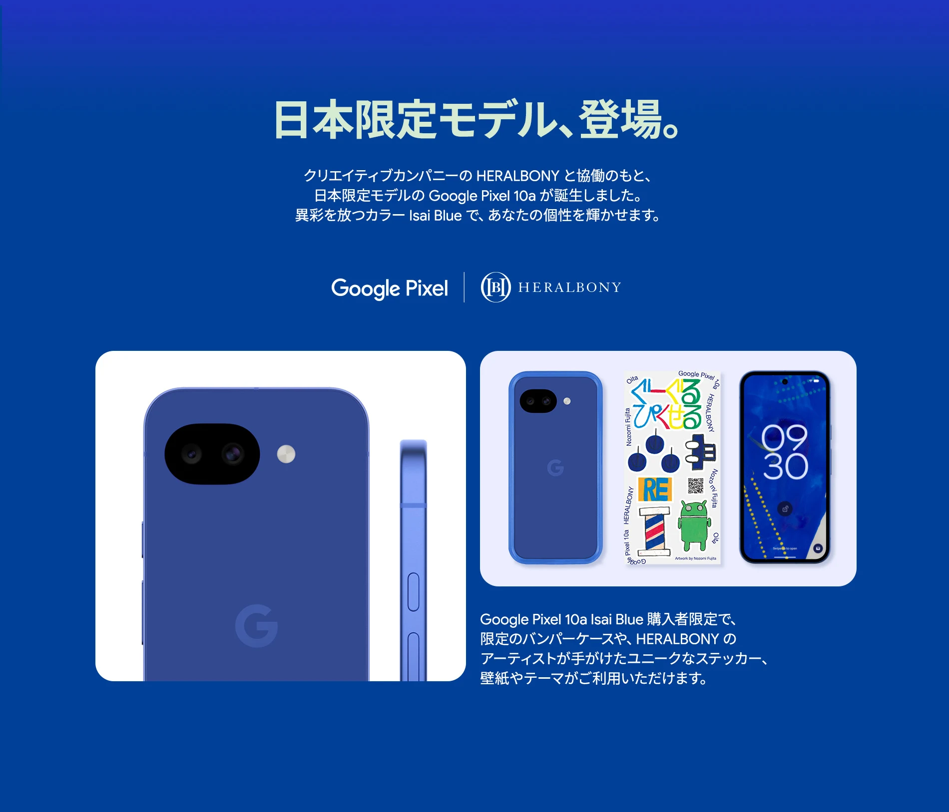1 バッテリー駆動時間は、さまざまな要因によって変動し、特定の機能を使用すると短くなります。実際のバッテリー駆動時間はこれより短くなる可能性があります。長期にわたって使用してもバッテリーの健全性が保たれるよう、バッテリーのパフォーマンスは Google Pixel のソフトウェアにより継続的に管理されます。詳しくは g.co/pixel/battery-tests および g.co/pixel/batteryhealth をご覧ください。 2 Google 45W USB-C® 充電器(別売り)を使用すると、有線にて最大 30 W で充電が可能です。 3 Google Pixel アップデートが提供される期間は、米国の Google ストアでのデバイス販売開始日から 7 年間です。詳しくは、g.co/pixel/updates をご覧ください。 4 お使いの Google Pixel の Android OS アップデートおよびサポート期間中は、原則として Pixel Drop が提供されます。詳しくは、 g.co/pixel/updates をご覧ください。一部の Pixel Drop については、スマートフォンやデバイスの機種によって提供状況が異なる場合があります。 5 インターネット接続が必要です。機能は有料会員登録の有無やアカウントに応じて異なる場合があります。一部のアプリについてはセットアップが必要です。一部のデバイス、国、言語でご利用いただけます。 6 Google Pixel 9a との比較です。 7 デバイスは工場出荷時点で IEC 規格 60529 の IP68 の防水および防塵性能を満たすように設計されていますが、完全な防水または防塵ではありません。防水・防塵性能は永久的には持続せず、時間の経過に伴い、通常の使用による摩耗、デバイスの修理、分解、損傷によって徐々に低下または消失します。デバイスの耐落下性能は完全なものではありません。デバイスを落下させると、防水、防塵性能が失われる場合があります。落下その他の外的な衝撃による損傷は保証の対象外となります。液体による損傷の場合、保証が無効になります。詳しくは、 g.co/pixel/water をご覧ください。® GORILLA は、 Corning Incorporated の登録商標です。 8 ストレージの仕様はフォーマット前の容量を表しています。フォーマット後の実際の容量はこれより少なくなります。 9 ディスプレイは角に丸みがあります。長方形として対角線を測定したときのサイズは 6.3 インチです。実際の表示可能領域はこれより小さくなります。サイズは構成および製造工程によって異なる場合があります。 10 重量ベースで、製品の 36% 以上にリサイクル素材を使用しています。 11 使用状況によって結果は変化する場合があります。 12 詳しくは、g.co/photos/ask をご覧ください。使用状況によって結果は変化する場合があります。対象年齢は 18 歳以上です。 13 Gemini モバイルアプリの提供状況は、国と言語によって異なる場合があります。回答の正確性をお確かめください。インターネット接続が必要です。 14 説明を目的とした出力結果の例です。内容は状況に応じて変わります。回答の正確性をお確かめください。一部の機能とアカウントに対応しています。インターネット接続が必要です。一部の国と言語で利用できます。対象年齢は 18 歳以上です。 15 インターネット接続が必要です。利用できる機能は、サブスクリプションやアカウントによって異なる場合があります。一部のアプリについてはセットアップが必要です。一部のデバイス、国、言語でご利用いただけます。 16 インターネット接続、対応デバイス、対応アプリ、および対応サーフェスが必要です。結果は画像の一致状況によって異なります。 17 言語や国によって利用できない場合があります。詳しくは、 g.co/pixel/callassist をご覧ください。実際の結果は使用状況によって異なります。詳しくは、 g.co/pixel/callassist をご覧ください。 18 回答の正確性をお確かめください。一部の機能とアカウントに対応しています。インターネット接続が必要です。一部の国と言語で利用できます。対象年齢は 18 歳以上です。 AI 生成機能は、ご自身の責任でご利用ください。詳しくは、 policies.google.com/terms/generative-ai/use-policy をご覧ください。 19 制限事項が適用されます。 一部のデータは VPN を介さず送信されます。 一部の国ではご利用いただけません。 VPN を使用すると、料金プランによってはデータ費用が増加する可能性があります。詳しくは g.co/pixel/vpn をご覧ください。 20 言語や国・地域によっては、自動車事故検出を利用できない場合があります。自動車事故検出によってすべての事故が検出されるとは限りません。強い衝撃がかかることで、自動車事故検出が作動することがあります。この機能はネットワーク接続やその他の要因によって、緊急時の通信手段として利用できないことがあります。また、一部の地域ではご利用いただけない場合があります。詳しくは、 g.co/pixel/carcrashdetection をご確認ください。 21 Google Pixel 10 シリーズ、9 シリーズ ( Google Pixel 9a を除く) のデバイスでご利用いただけます。( 2026 年 3 月 17 日現在)。今後も対応機種は変更する可能性があります。本機能の動作に関す