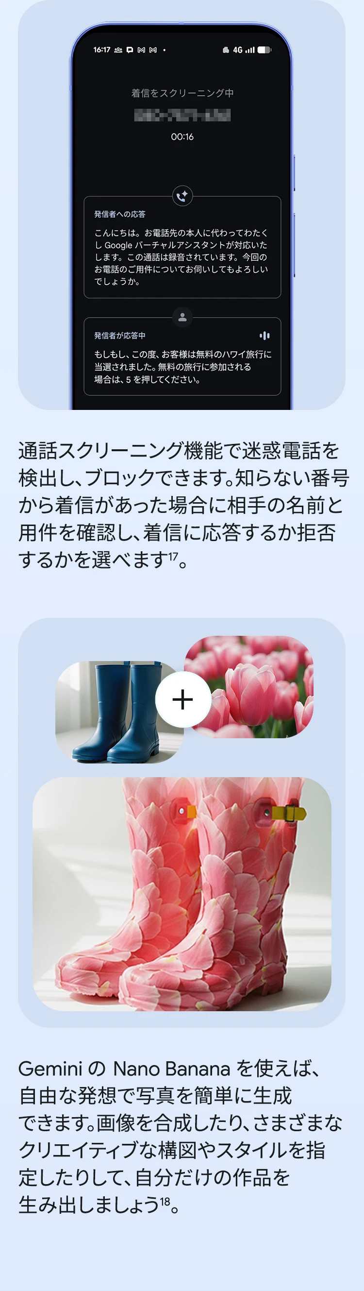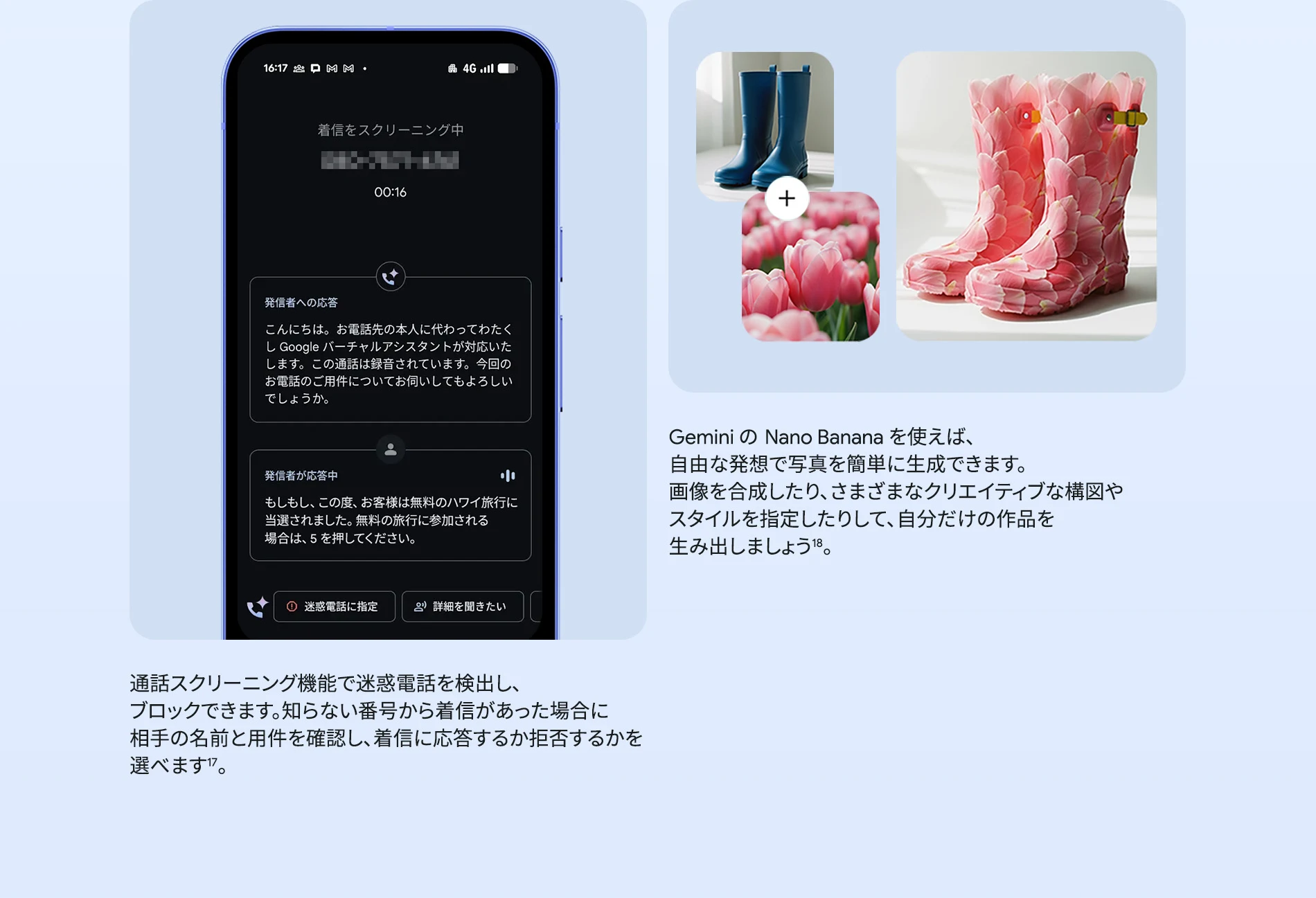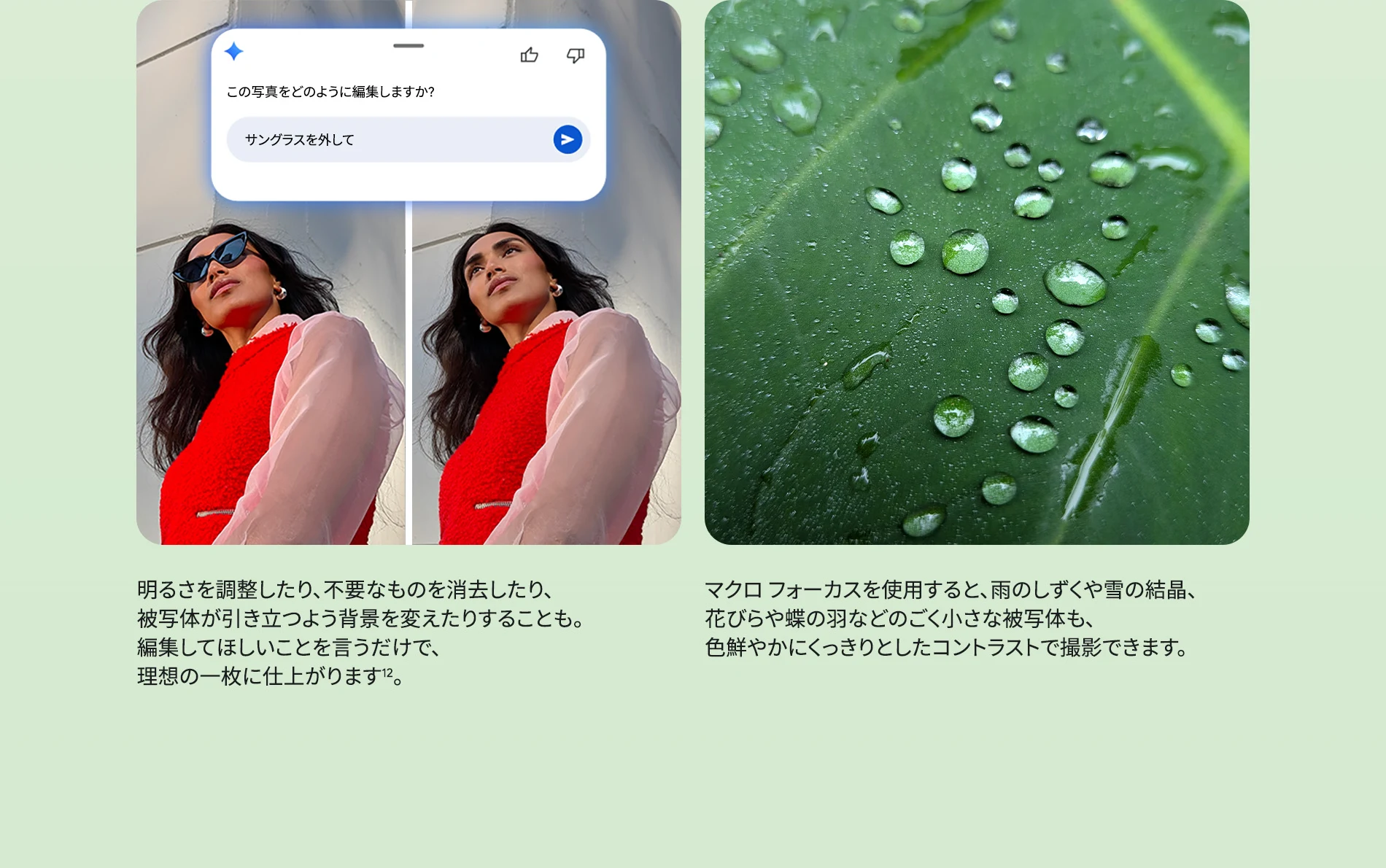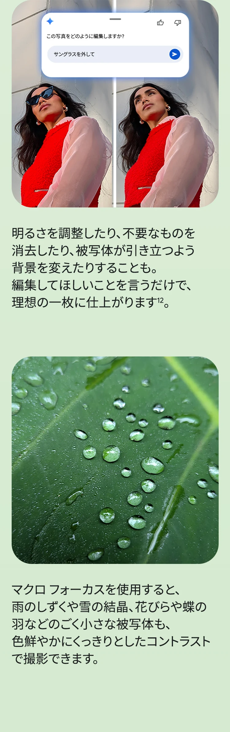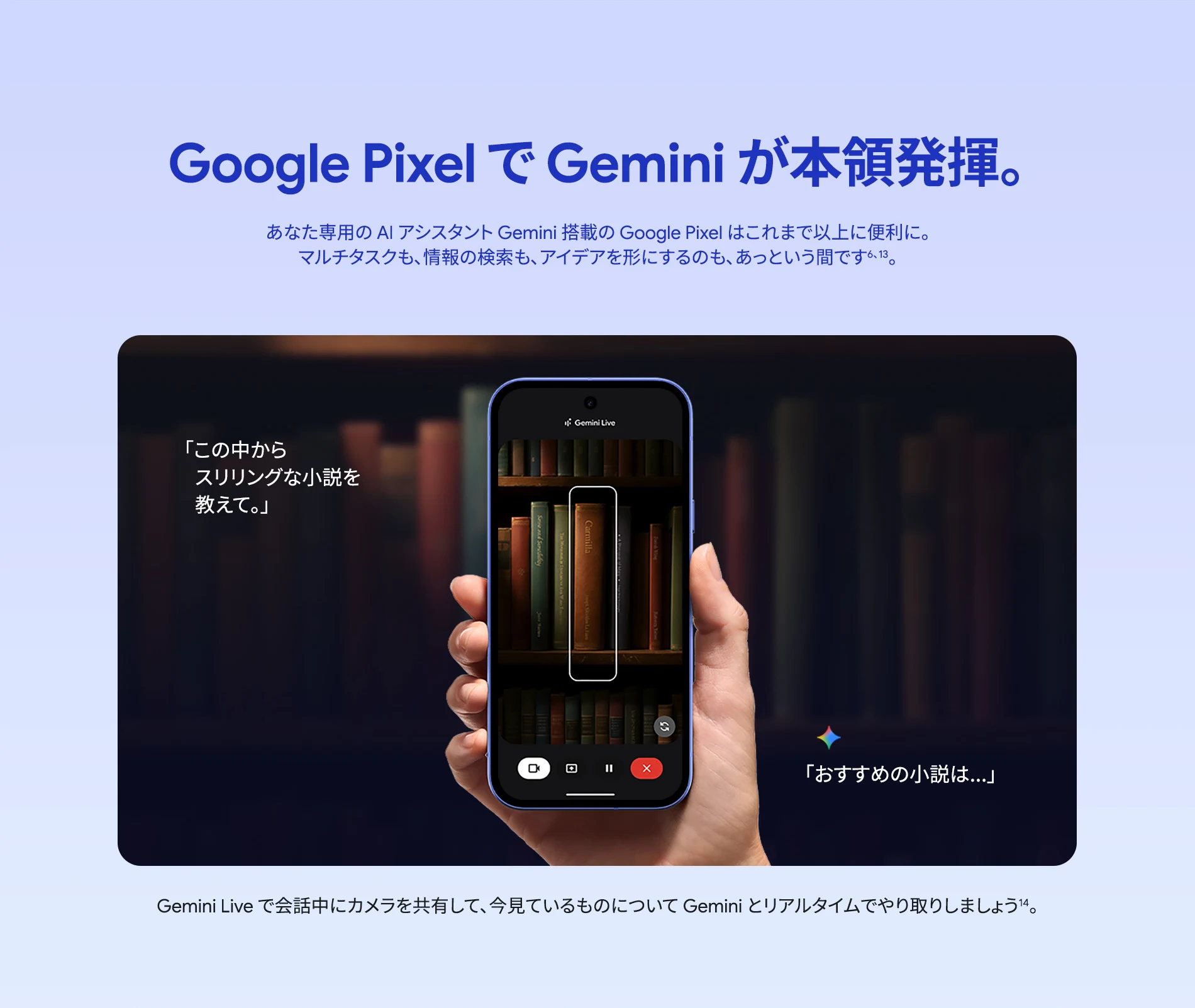1 バッテリー駆動時間は、さまざまな要因によって変動し、特定の機能を使用すると短くなります。実際のバッテリー駆動時間はこれより短くなる可能性があります。長期にわたって使用してもバッテリーの健全性が保たれるよう、バッテリーのパフォーマンスは Google Pixel のソフトウェアにより継続的に管理されます。詳しくは g.co/pixel/battery-tests および g.co/pixel/batteryhealth をご覧ください。 2 Google 45W USB-C® 充電器(別売り)を使用すると、有線にて最大 30 W で充電が可能です。 3 Google Pixel アップデートが提供される期間は、米国の Google ストアでのデバイス販売開始日から 7 年間です。詳しくは、g.co/pixel/updates をご覧ください。 4 お使いの Google Pixel の Android OS アップデートおよびサポート期間中は、原則として Pixel Drop が提供されます。詳しくは、 g.co/pixel/updates をご覧ください。一部の Pixel Drop については、スマートフォンやデバイスの機種によって提供状況が異なる場合があります。 5 インターネット接続が必要です。機能は有料会員登録の有無やアカウントに応じて異なる場合があります。一部のアプリについてはセットアップが必要です。一部のデバイス、国、言語でご利用いただけます。 6 Google Pixel 9a との比較です。 7 デバイスは工場出荷時点で IEC 規格 60529 の IP68 の防水および防塵性能を満たすように設計されていますが、完全な防水または防塵ではありません。防水・防塵性能は永久的には持続せず、時間の経過に伴い、通常の使用による摩耗、デバイスの修理、分解、損傷によって徐々に低下または消失します。デバイスの耐落下性能は完全なものではありません。デバイスを落下させると、防水、防塵性能が失われる場合があります。落下その他の外的な衝撃による損傷は保証の対象外となります。液体による損傷の場合、保証が無効になります。詳しくは、 g.co/pixel/water をご覧ください。® GORILLA は、 Corning Incorporated の登録商標です。 8 ストレージの仕様はフォーマット前の容量を表しています。フォーマット後の実際の容量はこれより少なくなります。 9 ディスプレイは角に丸みがあります。長方形として対角線を測定したときのサイズは 6.3 インチです。実際の表示可能領域はこれより小さくなります。サイズは構成および製造工程によって異なる場合があります。 10 重量ベースで、製品の 36% 以上にリサイクル素材を使用しています。 11 使用状況によって結果は変化する場合があります。 12 詳しくは、g.co/photos/ask をご覧ください。使用状況によって結果は変化する場合があります。対象年齢は 18 歳以上です。 13 Gemini モバイルアプリの提供状況は、国と言語によって異なる場合があります。回答の正確性をお確かめください。インターネット接続が必要です。 14 説明を目的とした出力結果の例です。内容は状況に応じて変わります。回答の正確性をお確かめください。一部の機能とアカウントに対応しています。インターネット接続が必要です。一部の国と言語で利用できます。対象年齢は 18 歳以上です。 15 インターネット接続が必要です。利用できる機能は、サブスクリプションやアカウントによって異なる場合があります。一部のアプリについてはセットアップが必要です。一部のデバイス、国、言語でご利用いただけます。 16 インターネット接続、対応デバイス、対応アプリ、および対応サーフェスが必要です。結果は画像の一致状況によって異なります。 17 言語や国によって利用できない場合があります。詳しくは、 g.co/pixel/callassist をご覧ください。実際の結果は使用状況によって異なります。詳しくは、 g.co/pixel/callassist をご覧ください。 18 回答の正確性をお確かめください。一部の機能とアカウントに対応しています。インターネット接続が必要です。一部の国と言語で利用できます。対象年齢は 18 歳以上です。 AI 生成機能は、ご自身の責任でご利用ください。詳しくは、 policies.google.com/terms/generative-ai/use-policy をご覧ください。 19 制限事項が適用されます。 一部のデータは VPN を介さず送信されます。 一部の国ではご利用いただけません。 VPN を使用すると、料金プランによってはデータ費用が増加する可能性があります。詳しくは g.co/pixel/vpn をご覧ください。 20 言語や国・地域によっては、自動車事故検出を利用できない場合があります。自動車事故検出によってすべての事故が検出されるとは限りません。強い衝撃がかかることで、自動車事故検出が作動することがあります。この機能はネットワーク接続やその他の要因によって、緊急時の通信手段として利用できないことがあります。また、一部の地域ではご利用いただけない場合があります。詳しくは、 g.co/pixel/carcrashdetection をご確認ください。 21 Google Pixel 10 シリーズ、9 シリーズ ( Google Pixel 9a を除く) のデバイスでご利用いただけます。( 2026 年 3 月 17 日現在)。今後も対応機種は変更する可能性があります。本機能の動作に関す