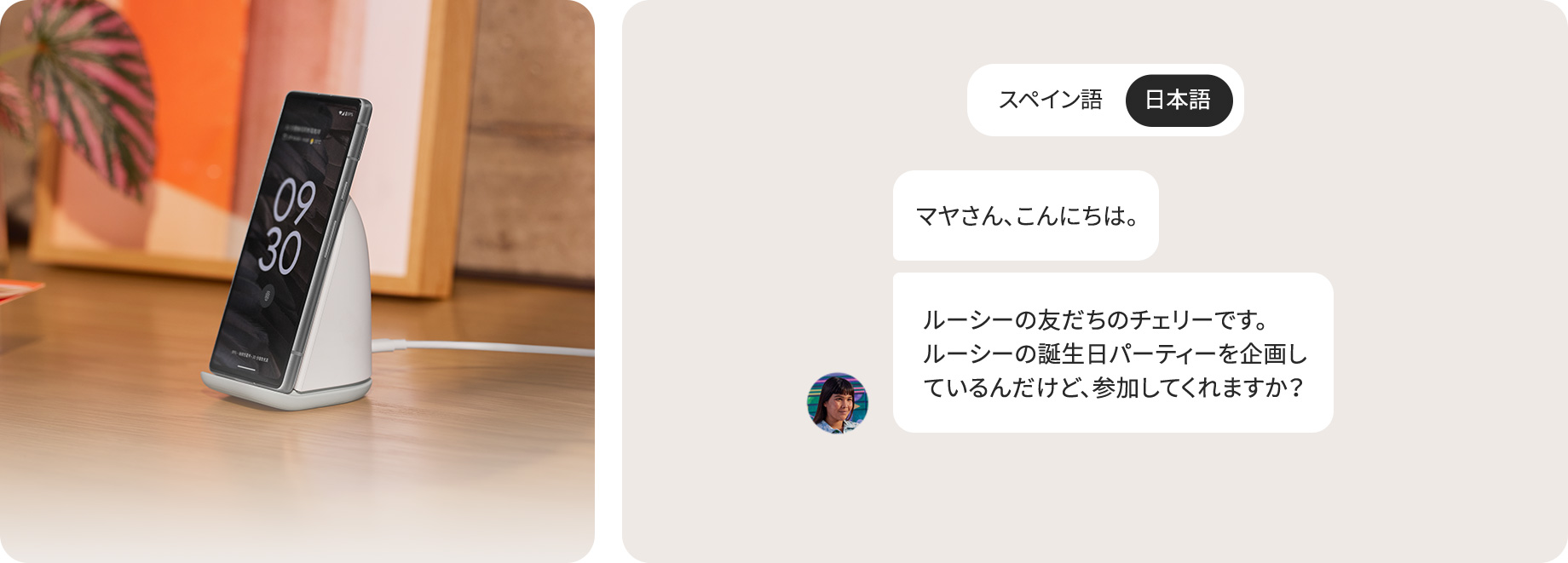 USB-C® は USB Implementers Forum の商標です。1 Google Pixel Stand と Google Pixel Buds Pro は別売りです。2 最大 18 ワット。有線での急速充電の速度は、コンセントに接続した Google 30W USB-C® 充電器の使用を前提としています。実際の充電速度は遅くなる可能性があります。USB-PD 3.0(PPS)対応 30W USB-C® 充電器は別売りです。