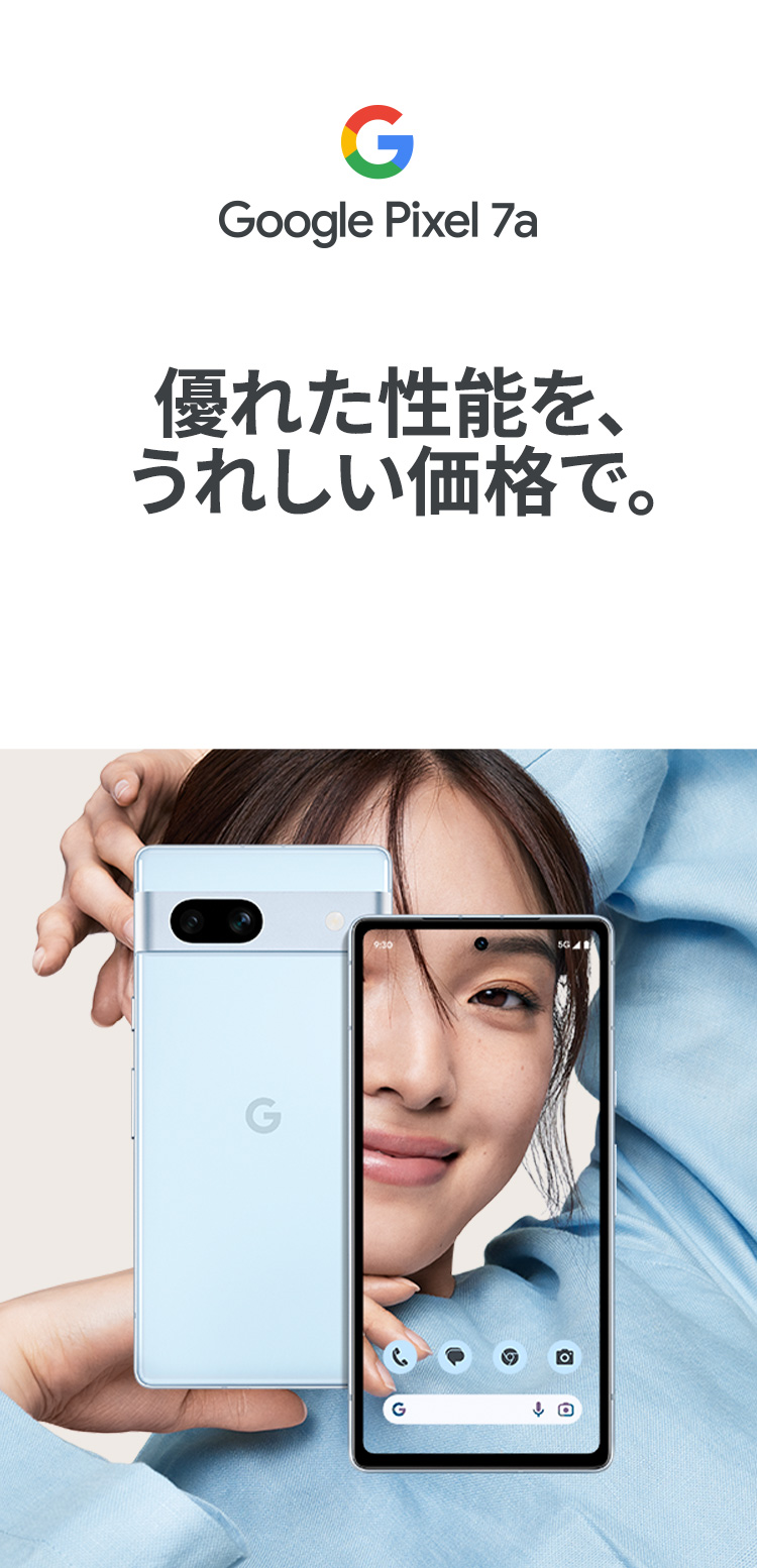1 通話スクリーニングは言語や国によって利用できない場合があります。詳しくは g.co/help/callscreen をご覧ください。Direct My Call は米国内で英語のみで利用でき、フリーダイヤルにのみ対応します。また、お店やサービスによっては利用できないことがあります。 2 サードパーティのグローバル調査企業によるレポートに基づいています。評価された機能は、一部の国ではご利用いただけない場合があります。詳しくは、goo.gle/mobilesecurity2022 をご覧ください。 3「24 時間」について: バッテリー駆動時間は、Google Pixel ユーザーのバッテリー使用プロファイル中央値を使用して、通話、データ通信、待受やその他の機能の使用などを組み合わせたテストに基づく推定値です。テスト中の平均バッテリー駆動時間はおよそ 31 時間です。バッテリーのテストは、携帯通信会社大手 1 社のネットワークで実施しました。「最大 72 時間」について: バッテリー駆動時間は、Google Pixel ユーザーのバッテリー使用プロファイル中央値を使用して、通話、データ通信、待受や、(5G 接続を含むさまざまな機能が無効になる)スーパー バッテリー セーバー モードでもデフォルトでオンになっているその他一部の機能を組み合わせたテストに基づく推定値です。バッテリーのテストは、携帯通信会社大手 1 社のネットワークで実施しました。「24 時間以上」と「最大 72 時間」のテストについて: バッテリー テストは、2022 年後期に米国カリフォルニア州で、生産開始前の初期設定状態のハードウェアおよびソフトウェアを用いて実施されました(ただし「最大 72 時間」のバッテリー駆動時間のテストに限り、スーパー バッテリー セーバー モードを有効にしました)。バッテリー駆動時間はさまざまな要因によって変動します。特定の機能を使用すると短くなります。実際のバッテリー駆動時間はこれより短くなる可能性があります。