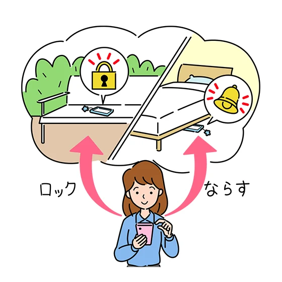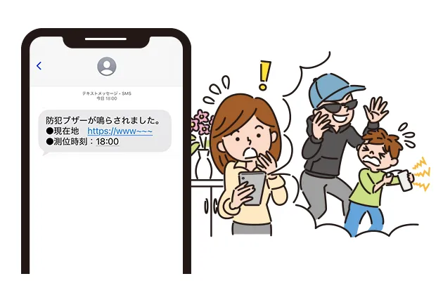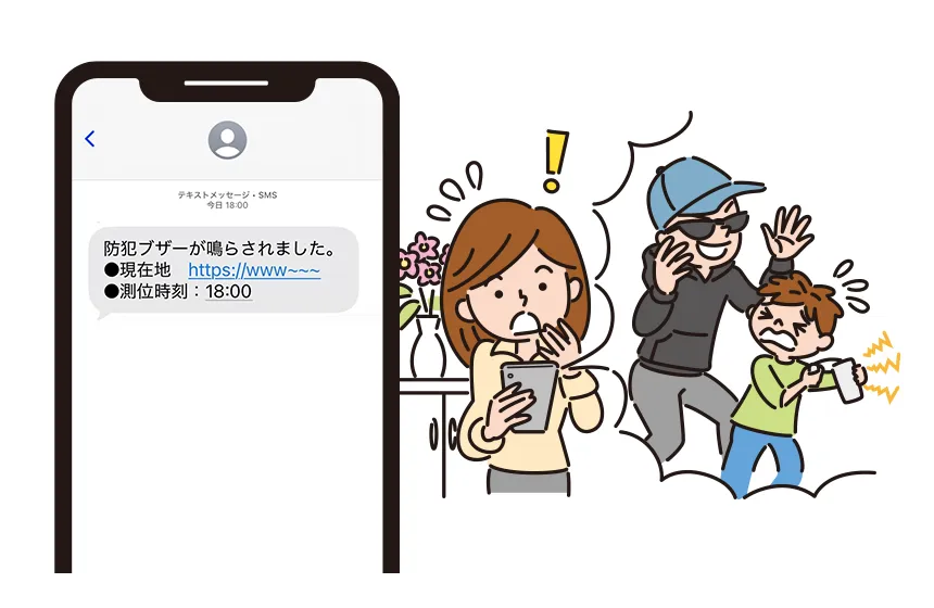 防犯ブザーを引っ張ると、位置情報と周囲を撮影した写真が保護者に自動で送信され、
