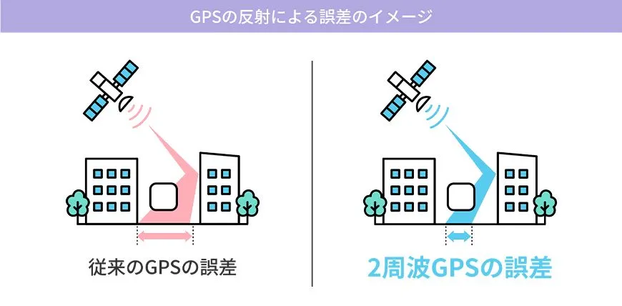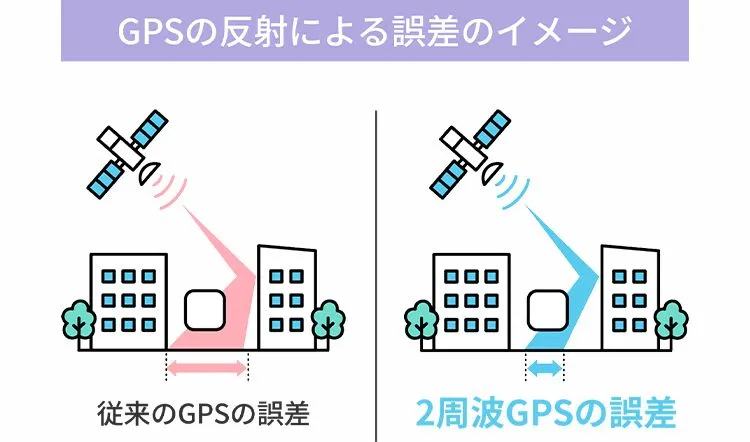 2周波GPSは、従来のGPSのL1信号に加えて、新たにL5信号を受信できます。GPSで誤差が生じる理由の1つは、高いビルや木々などにGPS信号が反射してしまい、正しい場所を測位できなくなるためです。L5信号は、その反射(マルチパス誤差)を抑止する能力が、L1信号の最大10倍優れています。