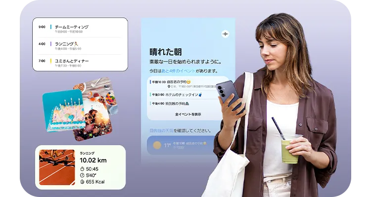 - *3「Now Brief」機能を使用するには、Samsungアカウントへのログインが必要です。サービスの利用可否は、国や地域、言語、デバイスモデル、アプリによって異なる場合があります。コンテキストに応じたルーチンの提案で、Personal Data Engineを使うには、モードとルーチンを有効にする必要があります。