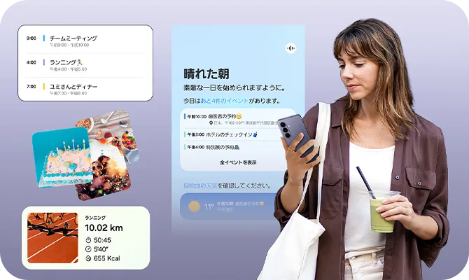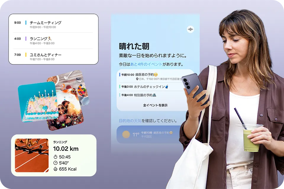 - *3「Now Brief」機能を使用するには、Samsungアカウントへのログインが必要です。サービスの利用可否は、国や地域、言語、デバイスモデル、アプリによって異なる場合があります。コンテキストに応じたルーチンの提案で、Personal Data Engineを使うには、モードとルーチンを有効にする必要があります。