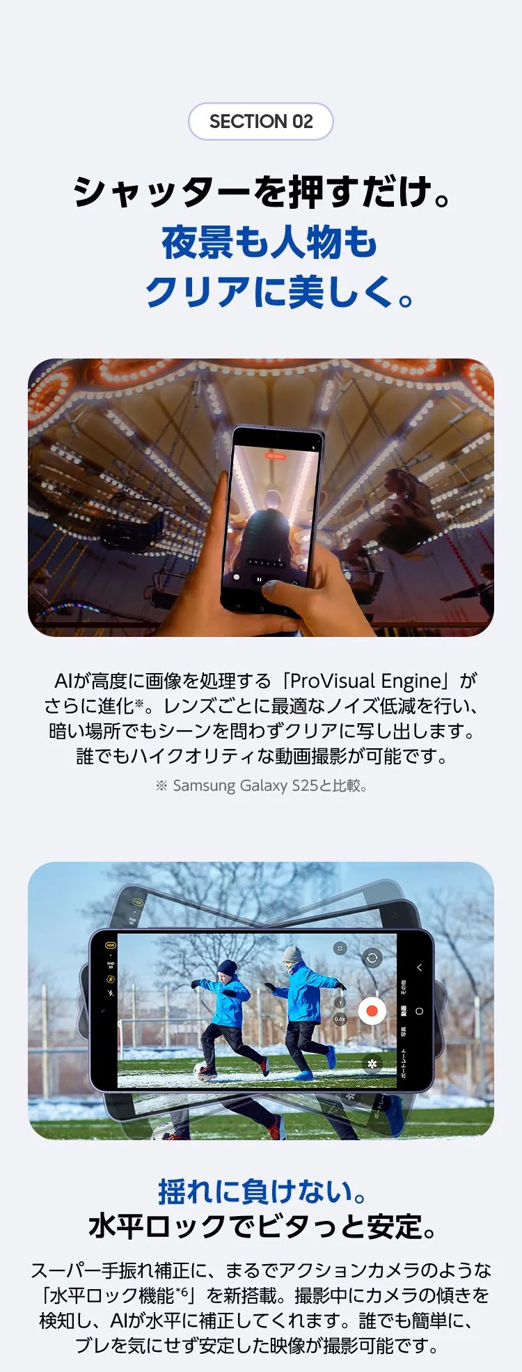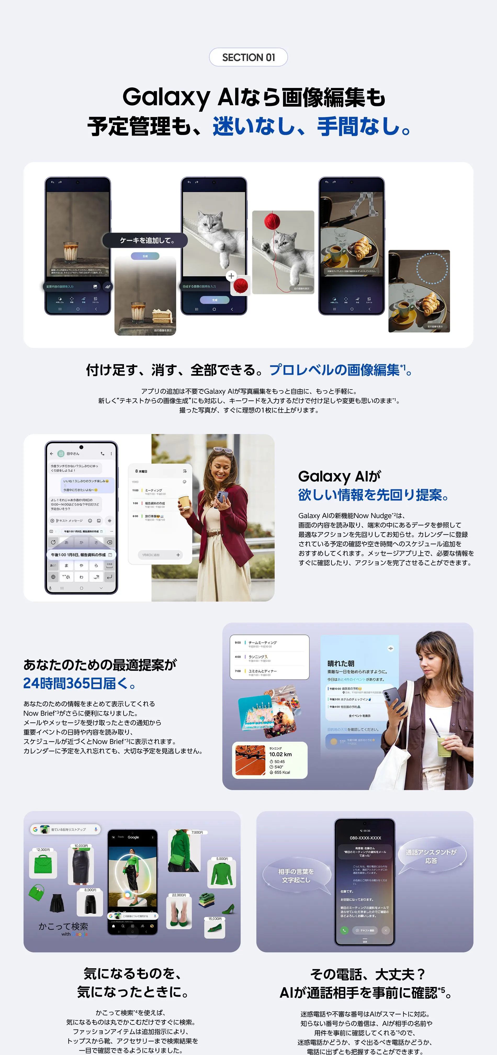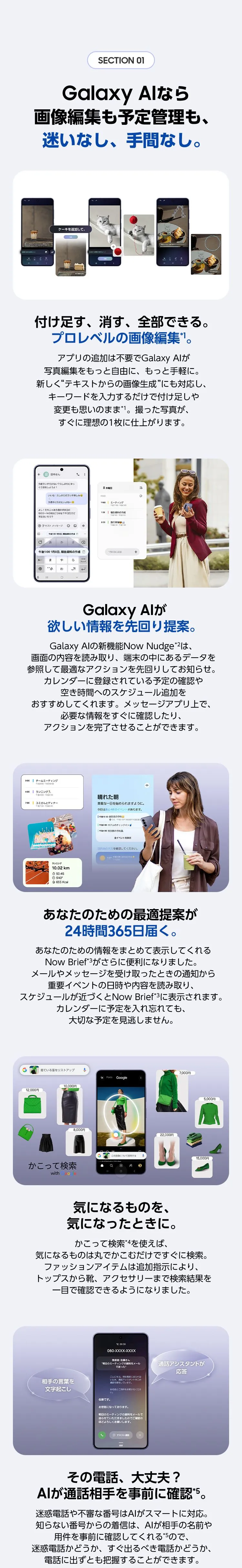 - *1フォトアシストはネットワークへの接続とSamsungアカウントへのログインが必要です。フォトアシストで編集すると、画像がリサイズされます。画像がAIによって生成されたことを示すために、保存時に出力画像にウォーターマークが重ねられます。(特許ブランドやキャラクターコンテンツの複製を防止するための措置が講じられていますが、複製の回避を保証するものではありません。)生成された出力画像の正確性と信頼性は保証いたしません。
