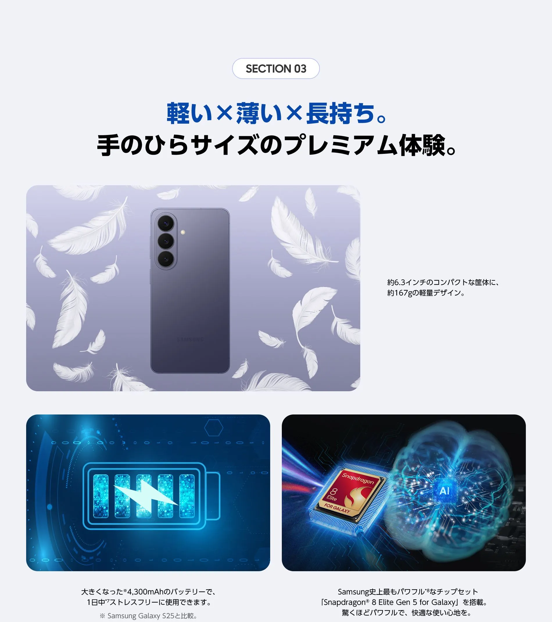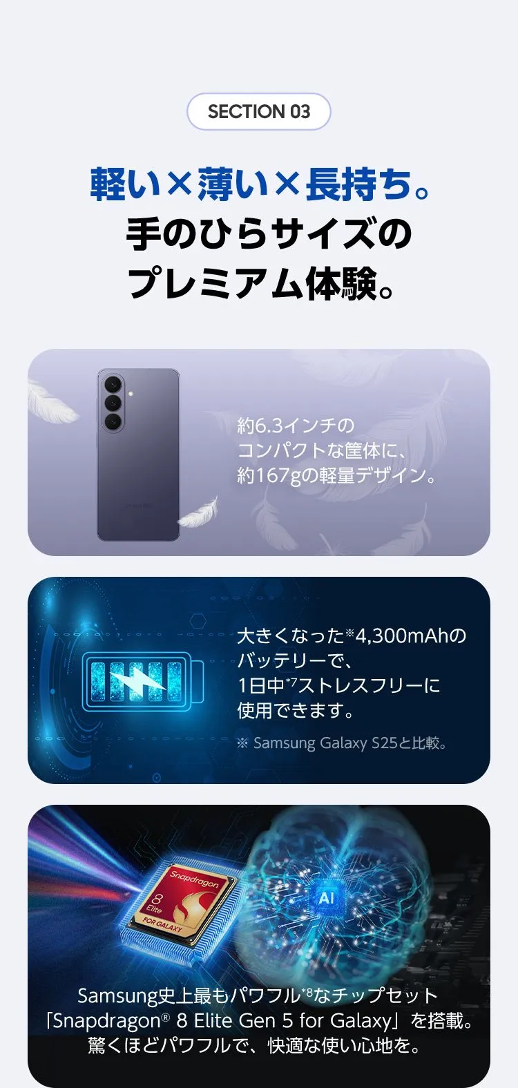 - *7実際のバッテリー駆動時間は、ネットワーク環境、使用する機能やアプリ、通話やメッセージの頻度、充電回数など、さまざまな要因によって異なる場合があります。