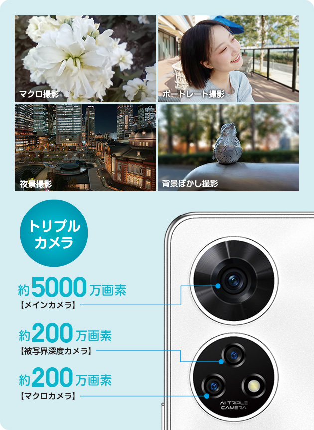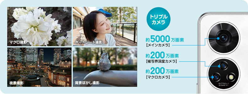 メインカメラ(約5000万画素)、高精細な写真や動画の撮影に。マクロカメラ(約200万画素)、被写体に近寄った迫力ある撮影に。被写界深度カメラ(約200万画素)、ぼけ感のある撮影に。
