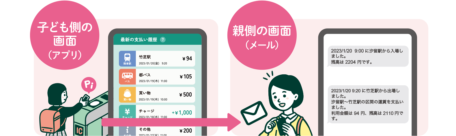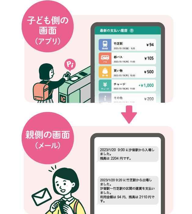 改札を通過した際などに、お子さまのアプリケーションから事前登録した連絡先へ自動でメールを送付します。