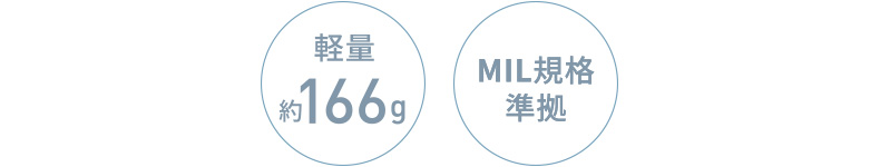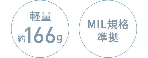 約166gと軽量でコンパクト。IPX5/8・IP6Xの防水・防塵※1とMIL規格準拠※2の耐衝撃ボディ。