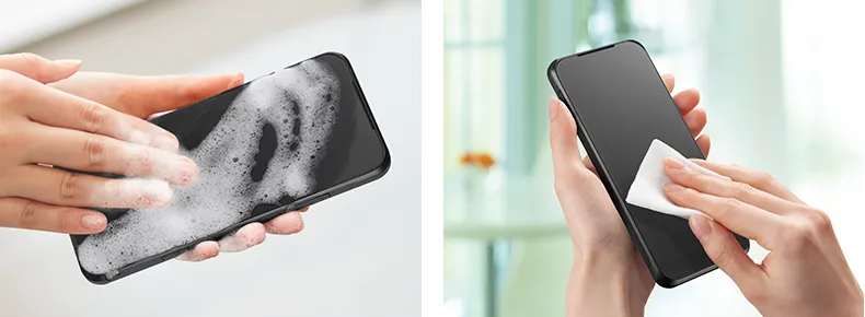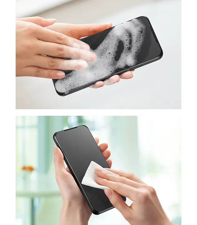 - 泡ハンドソープ/泡ボディソープのすすぎ残しによる石鹸カスが目立つ場合には、1.5 %程度に薄めたクエン酸液(クエン酸1.5gに水100ml)をしみ込ませた綿棒などで拭き取ってください。その後再度すすぎを実施して、クエン酸が残らないようにしてください。クエン酸がイヤホンマイク端子と外部接続端子(USB Type-C)に付着しないよう注意してください。