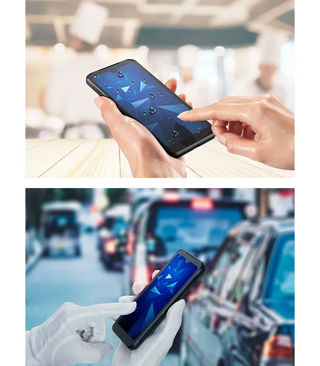 - ※6<京セラ独自の設計について> 京セラ独自の耐久試験(1.5mから26方向で鋼板への落下試験。1.0mの高さからのタンブル落下試験。泡ハンドソープ・泡ボディソープでの手洗い・すすぎ洗浄サイクル試験。アルコール対応での 独自試験を実施)を満たす設計です。