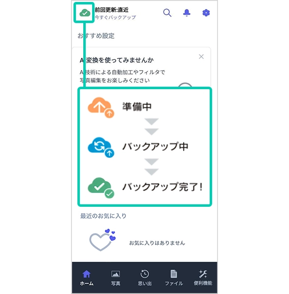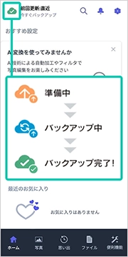 ・インターネット環境・データのアップロードサイズなどの条件によってバックアップが完了するまでに時間がかかる場合があります。