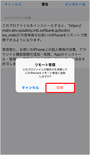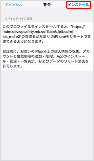 この画面が表示されない場合は、下部のメニューをタップし、「プロファイルインストール」を選択してください。