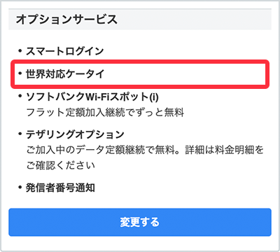 を確認するMy SoftBankの「オプションサービス」欄で「世界対応ケータイ」をご確認ください。