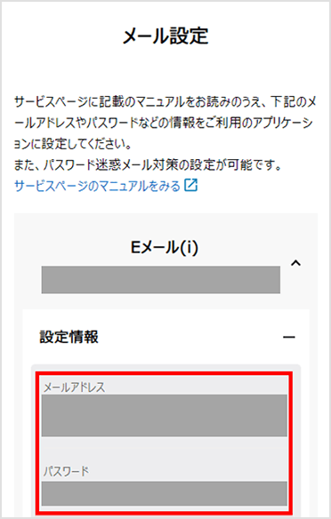 「Eメール(i)(v)」>「設定情報(+)」からメールアドレスとパスワードを確認します。