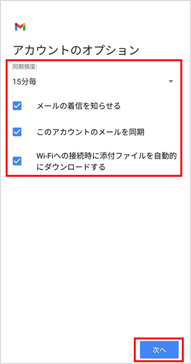 同期頻度 新着メールの問い合わせ頻度 メールの着信を知らせる 新着メールをステータスバーのアイコンや着信音で通知する場合、チェックする このアカウントのメールを同期 チェックする Wi-Fiへの接続時に添付ファイルを自動的にダウンロードする Wi-Fi接続時に自動的に添付ファイルをダウンロードする場合、チェックする -