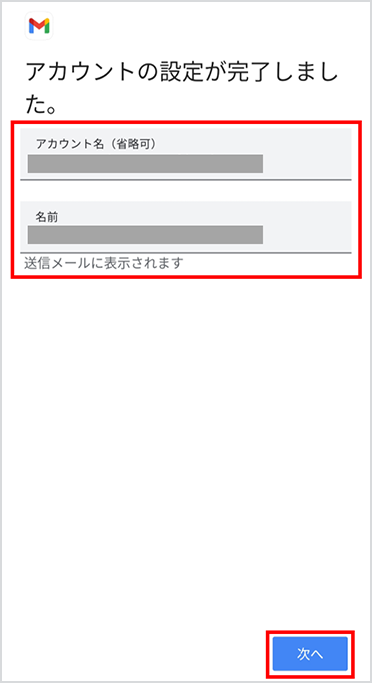 「名前」にメールの送信者として表示したい名前を入力し、「次へ」を選択します。