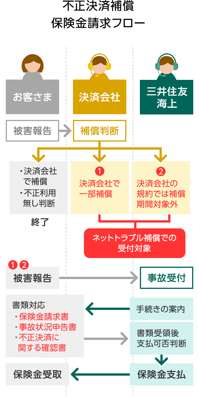 不正決済補償保険金請求フロー お客さま(被害報告)→決済会社(補償判断・決済会社で補償 ・不正利用なし判断→終了)(補償判断・①決済会社で一部補償 ・②決済会社の規約では補償期間対象外→ネットトラブル補償での受付対象) ①②被害報告(お客さま)→事故受付(三井住友海上)→手続きのご案内(三井住友海上)→書類対応 ・保険金請求書 ・事故状況申告書 ・不正決済に関する確認書(お客さま)→書類受領後支払可否判断(三井住友海上)→保険金支払(三井住友海上)→保険金受取(お客さま)