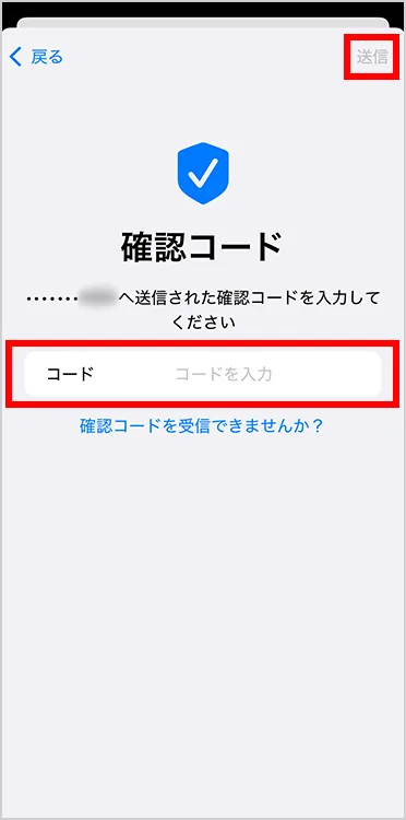 「確認コード」にて、4桁のコードを入力し「送信」を押して設定が完了です。