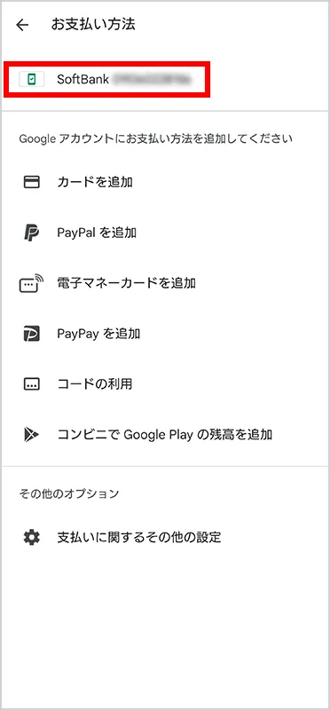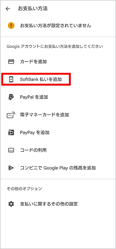 「SoftBank 払いを追加」を押します(ワイモバイル回線の場合は「Y!mobile払いを追加」として表示されます)。