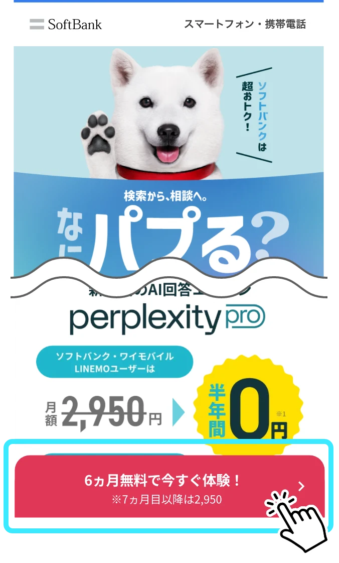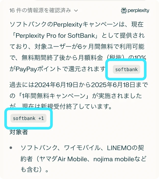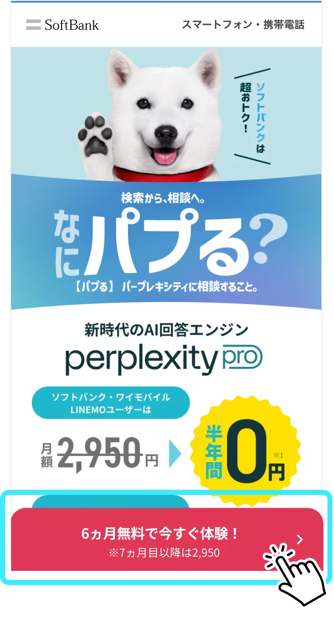 • 「1年間無料キャンペーン」をご利用中の方はPerplexity Pro for SoftBankにお申し込みいただけますが、6ヵ月無料は適用されません(「1年間無料キャンペーン」の残期間の終了後から、PerplexityPro for SoftBankの月額料金が発生します)。