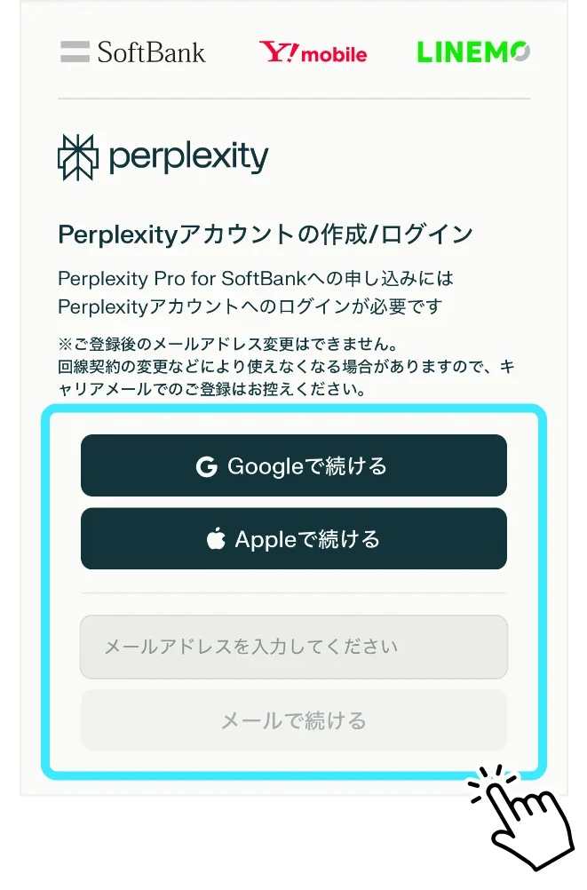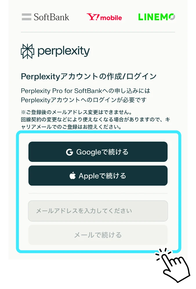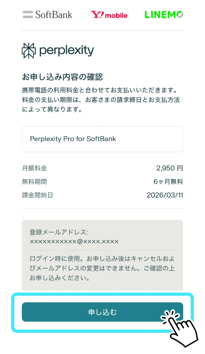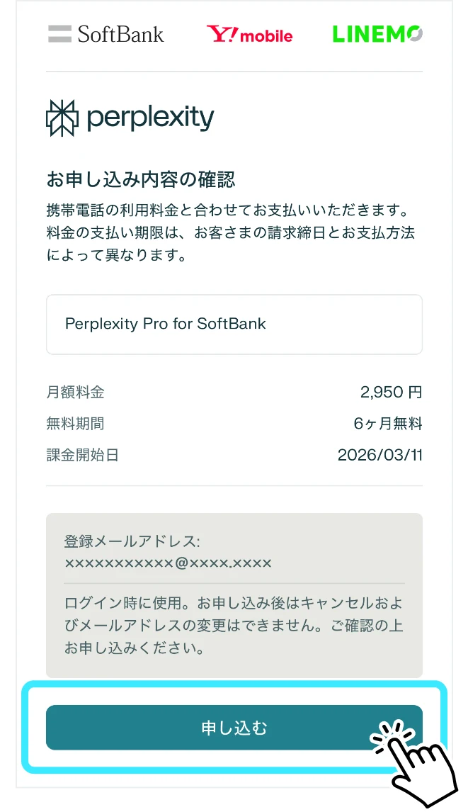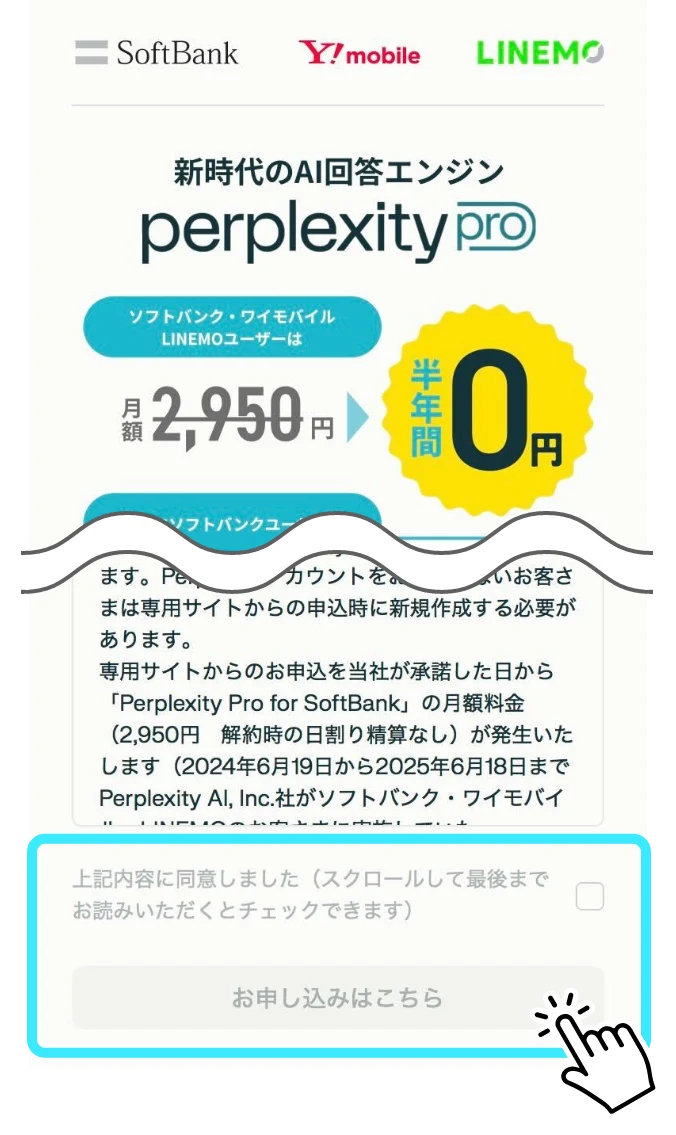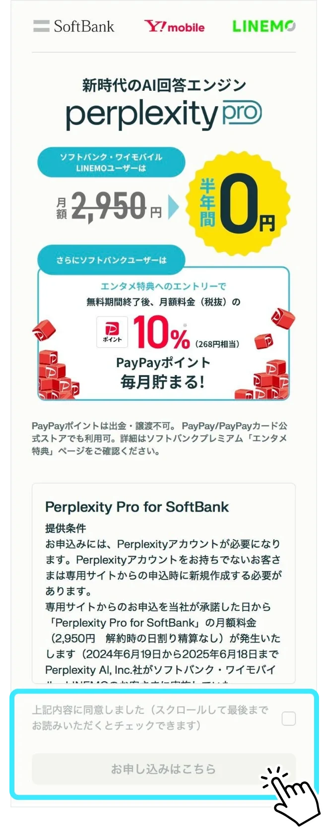 • お申込みに当たっては、Perplexity Pro for SoftBank提供条件書、Perplexity利用規約、Perplexity プライバシーポリシーへの同意が必要です。