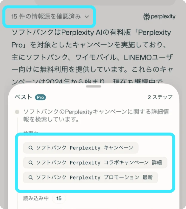 • Perplexity ProはPerplexity AI, Inc.が提供するサービスでありソフトバンク株式会社のサービスではありません。 Perplexity Proのサービス詳細は、Perplexity AI, Inc.のサービスサイトなどでご確認ください。 ソフトバンク株式会社はサービス内容などに関する保証はいたしかねます。