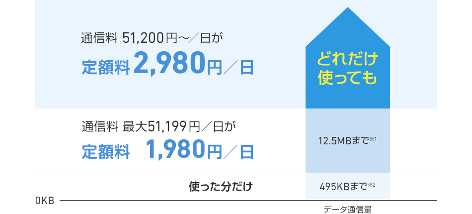 海外パケットし放題なら、海外でもメール・インターネットが最大2,980円/日でご利用いただけます。