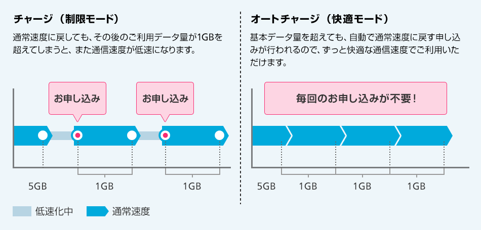 「オートチャージ(快適モード)」をお選びいただくと毎回の通常速度に戻す手続きが不要になりますが、ご利用状況によっては通信料金が高額になる可能性があります。