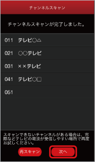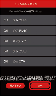 チャンネルスキャン完了画面で「次へ」をタップ